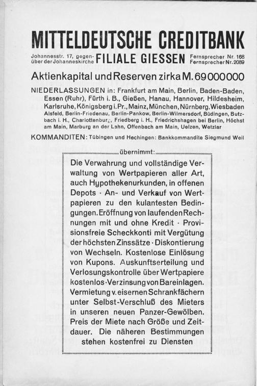 MITTELDEUTSCHE CREOTTSANK uber derdenannesthene FILIALE GIESSEN FemnseheM..2000 Aktienkapital und Reserven zirka M. 69000000