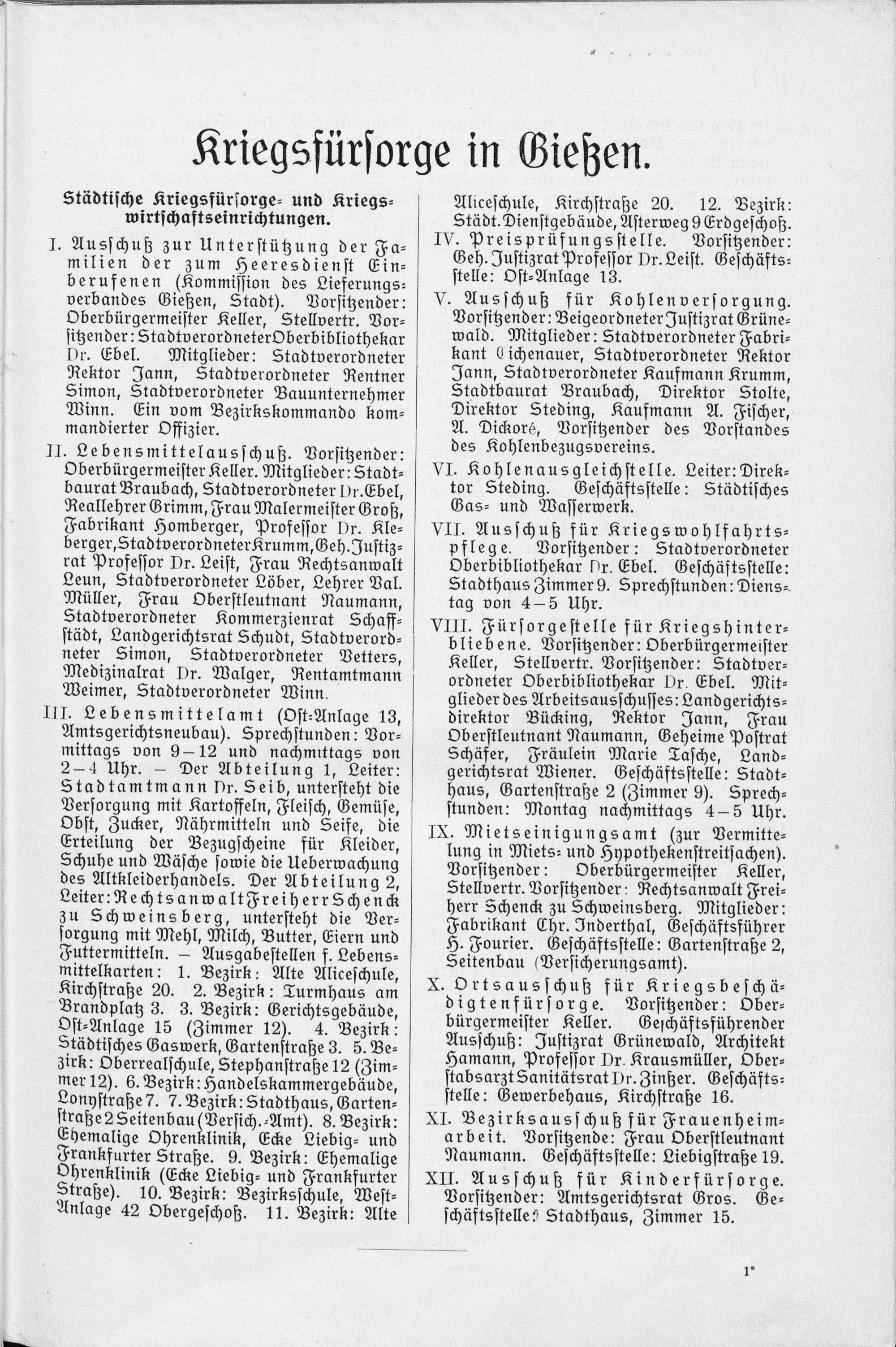 II. Lebensmittelausschuß. Vorsitzender: Oberbürgermeister Keller. Mitglieder: Stadt⸗ baurat Braubach, Stadtverordneter Dr.Ebel, Reallehrer Grimm, Frau Malermeister Groß, Fabrikant Homberger, Professor Dr. Kle⸗ berger, Stadtverordneter Krumm, Geh. Justiz⸗ rat Professor Dr. Leist, Frau Rechtsanwalt Leun, Stadtverordneter Löber, Lehrer Val. Müller, Frau Oberstleutnant Naumann, Stadtverordneter Kommerzienrat Schaff⸗ städt, Landgerichtsrat Schudt, Stadtverord— neter Simon, Stadtverordneter Vetters, Medizinalrat Dr. Walger, Rentamtmann Weimer, Stadtverordneter Winn.
