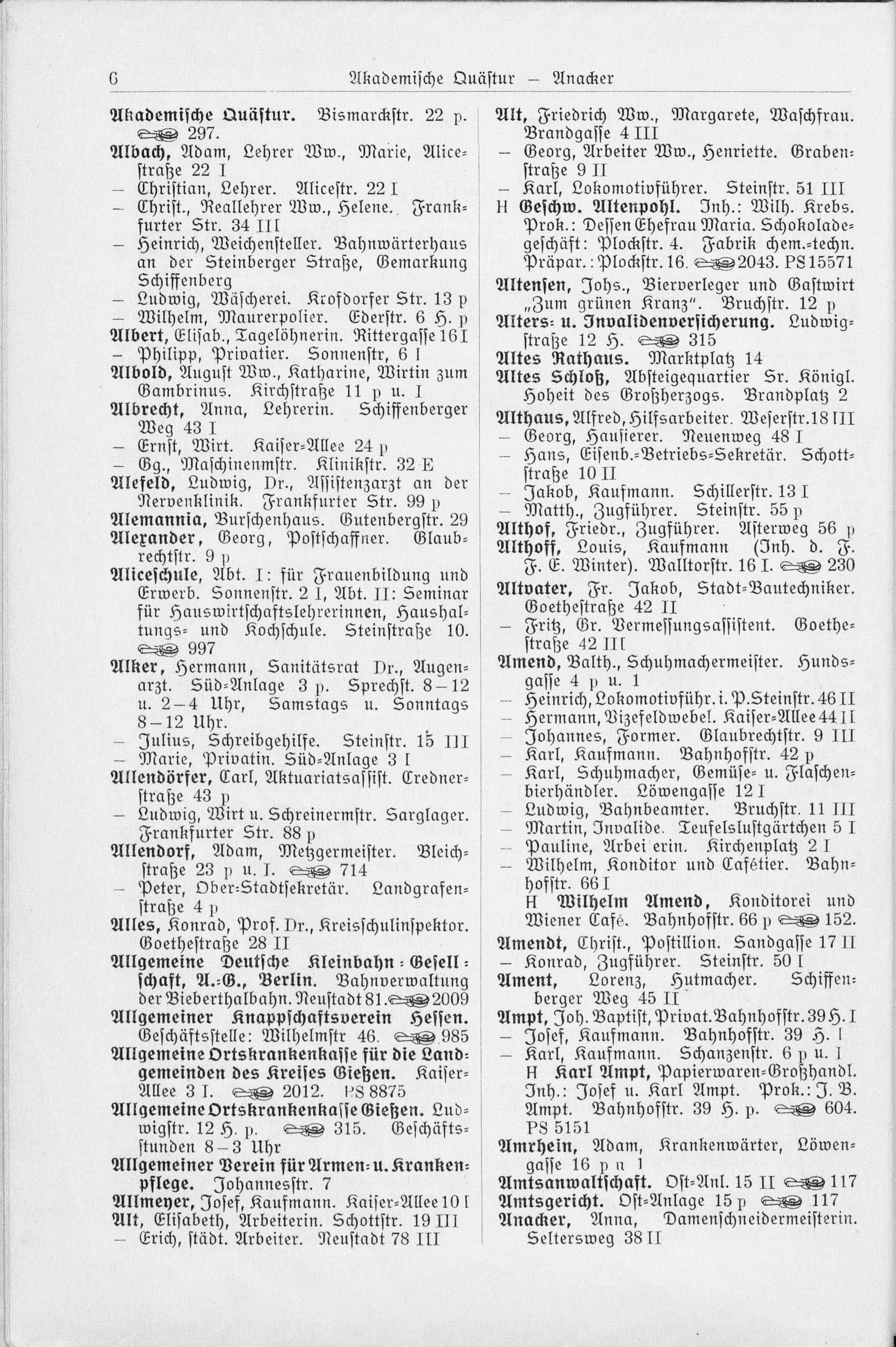 Allendorf, Adam, Metzgermeister. Bleich— straße 23 p u. J. 714 — Peter, Ober-Stadtsekretär. Landgrafen—