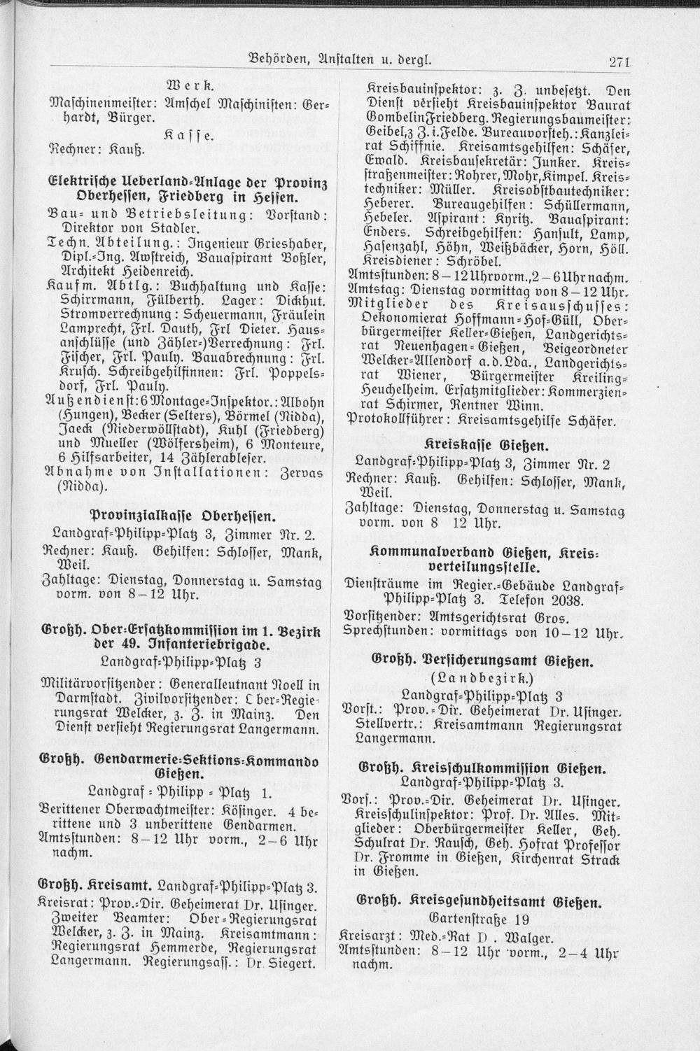 Großh. Versicherungsamt Gießen. (Landbezirh.) Landgraf⸗Philipp⸗Platz 3 Vorst.: Prov.⸗Dir. Geheimerat Dr. Usinger. Stellvertr.: Kreisamtmann Regierungsrat