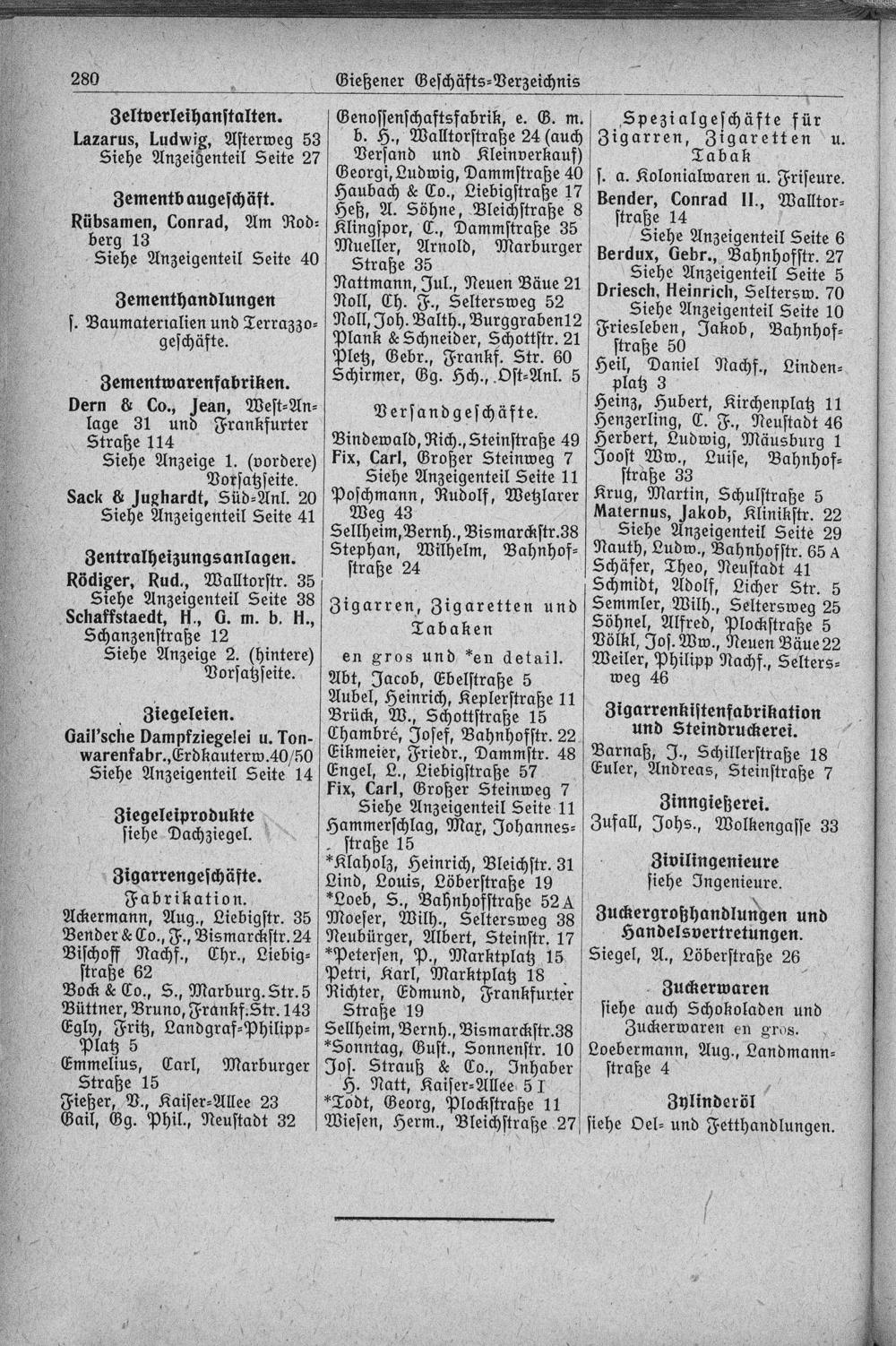 Versand und Kleinverkauf) Georgi, Ludwig, Dammstraße 40 Haubach& Co., Liebigstraße 17 Heß, A. Söhne, Bleichstraße 8 Klingspor, C., Dammstraße 35 Mueller, Arnold, Marburger