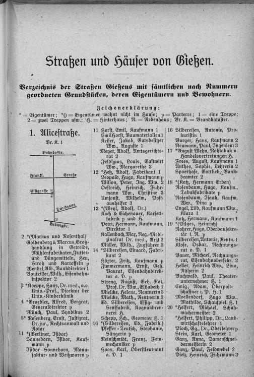 Verzeichnis der Straßen Gießens mit sämtlichen nach Nummern geordneten Grundstücken, deren Eigentümern und Bewohnern.