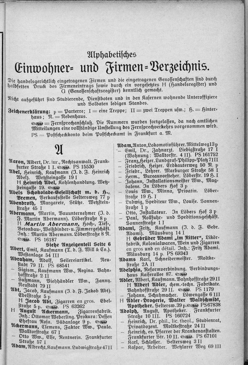 ö Aaron, Albert, Dr. iur., Rechtsanwalt. Frank⸗ furter Straße 1 I. S. PS 15530 Abel, Heinrich, Kaufmann(J. d. F. Heinrich ö Abel). Wetzsteingasse 191 ö H Heinrich Abel, Kohlenhandlung. Wetz⸗ ö steingasse 19. Abels Schokolade⸗Gesellschaft m. b. H., ů Bremen, Verkaufsstelle Seltersweg 77 p Abendroth, Margarete, Stütze. Wetzstein⸗ straße 45 1 Abermann, Martin, Bauunternehmer(J. d. F. Martin Abermann). Löberstraße 8 p HMartin Abermann, Hoch⸗, Tief⸗, Betonbau⸗„Weißbinder⸗ u. Zimmergeschäft. Inh.: Martin Abermann. Löberstraße 8 N. . P8 16187 Ab Siehe Anzeigenteil Seite 6 ert, Emil, Kaufmann(T. d. F. Will& Co.). é Westanlage 54 III braham, Adolf, Seilereiartikel. stadt 79 II. PS 68541 Sigism., Kaufmann Ww., Regina. Bahn⸗ hofstraße 2 11 — Sußmann, Viehhändler Ww., Fanny. bi, Iaohß 79 II „Jacob, Kaufmann(J. d. F. Jakob Abt). Ebelstraße 59