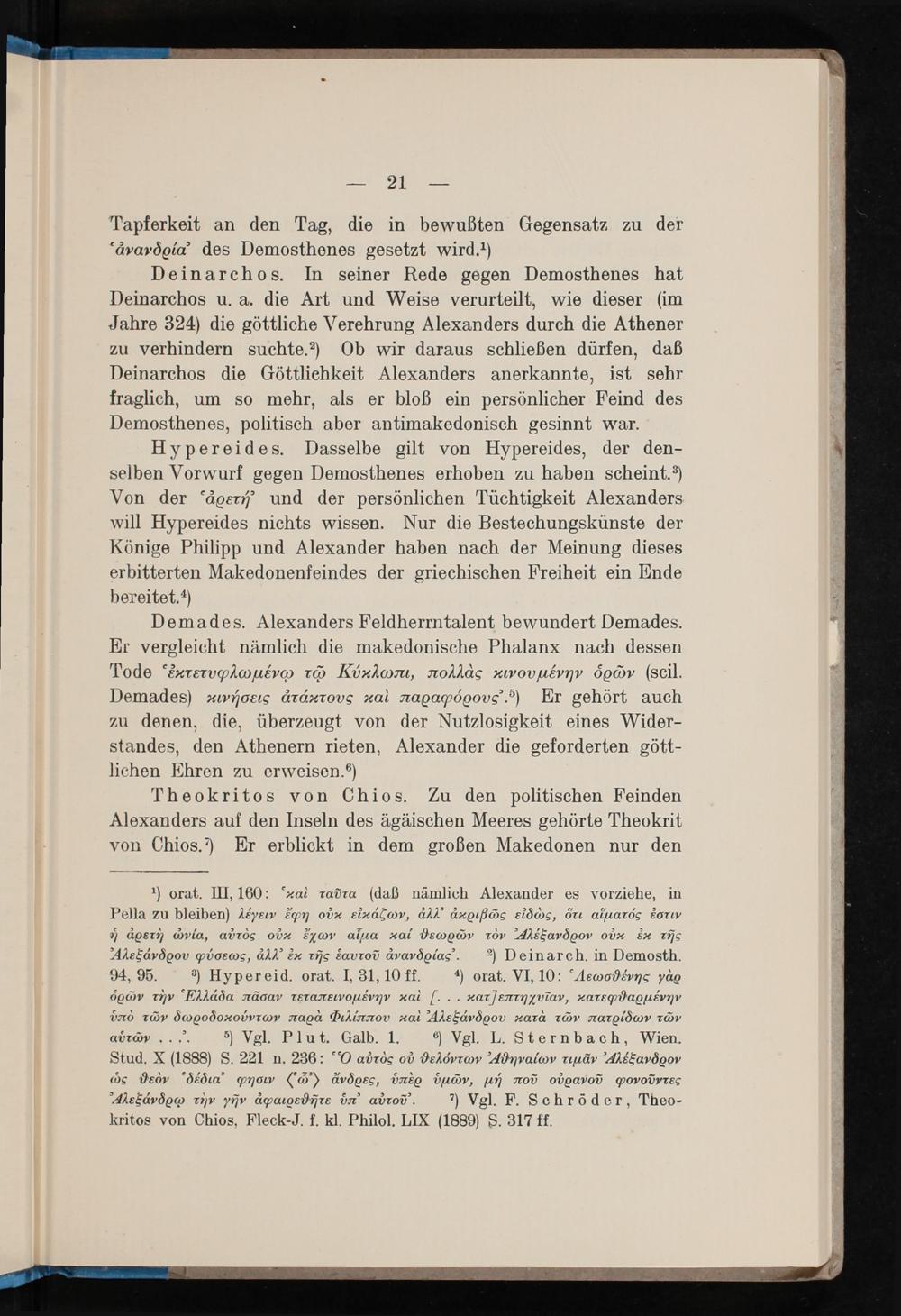 Deinarchos. In seiner Rede gegen Demosthenes hat Deinarchos u. a. die Art und Weise verurteilt, wie dieser(im Jahre 324) die göttliche Verehrung Alexanders durch die Athener zu verhindern suchte.) Ob wir daraus schließen dürfen, daß Deinarchos die Göttlichkeit Alexanders anerkannte, ist sehr fraglich, um so mehr, als er bloß ein persönlicher Feind des Demosthenes, politisch aber antimakedonisch gesinnt war.