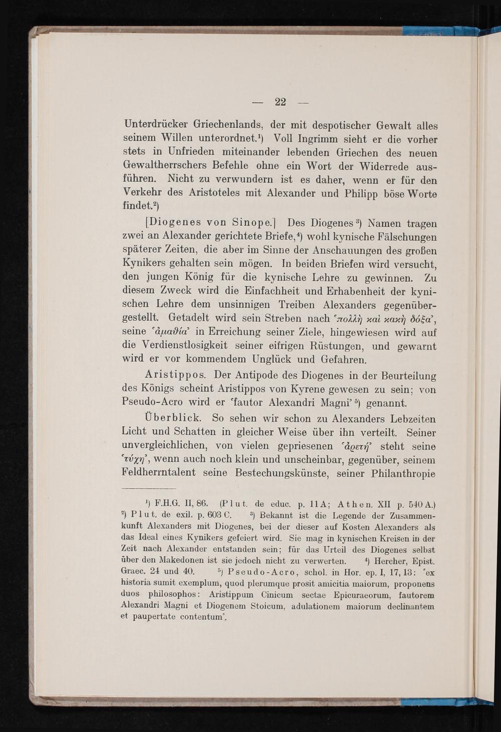 1) F.H. G. II, 86.(Plut. de educ. p. 11 A; Athen. XII p. 540 A.) ²) Plut. de exil. p. 603 C. ²) Bekannt ist die Legende der Zusammen- kunft Alexanders mit Diogenes, bei der dieser auf Kosten Alexanders als das Ideal eines Kynikers gefeiert wird. Sie mag in kynischen Kreisen in der Zeit nach Alexander entstanden sein; für das Urteil des Diogenes selbst über den Makedonen ist sie jedoch nicht zu verwerten. ¹) Hercher, Epist. Graec. 24 und 40. 5) Pseudo-Acro, schol. in Hor. ep. I, 17, 13: ex historia sumit exemplum, quod plerumque prosit amicitia maiorum, proponens duos philosophos: Aristippum Cinicum sectae Epicuraeorum, fautorem Alexandri Magni et Diogenem Stoicum, adulationem maiorum declinantem et paupertate contentum'.