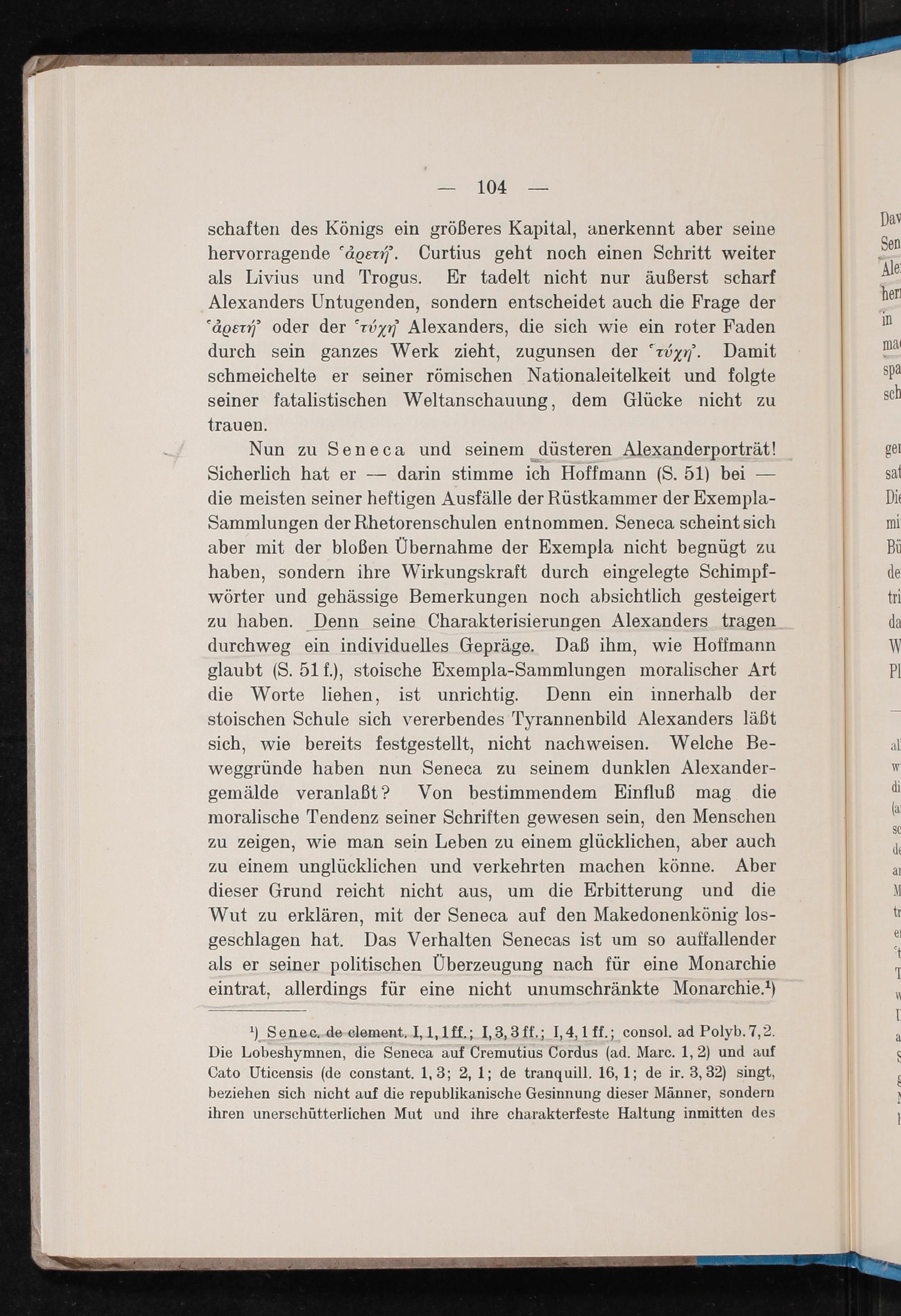 Nun zu Seneca und seinem düsteren Alexanderporträt! Sicherlich hat er— darin stimme ich Hoffmann(S. 51) bei— die meisten seiner heftigen Ausfälle der Rüstkammer der Exempla- Sammlungen der Rhetorenschulen entnommen. Seneca scheint sich aber mit der bloßen UÜbernahme der Exempla nicht begnügt zu haben, sondern ihre Wirkungskraft durch eingelegte Schimpf- wörter und gehässige Bemerkungen noch absichtlich gesteigert zu haben. Denn seine Charakterisierungen Alexanders tragen durchweg ein individuelles Gepräge. Daß ihm, wie Hoffmann glaubt(S. 51 f.), stoische Exempla-Sammlungen moralischer Art die Worte liehen, ist unrichtig. Denn ein innerhalb der stoischen Schule sich vererbendes Tyrannenbild Alexanders läßt sich, wie bereits festgestellt, nicht nachweisen. Welche Be- weggründe haben nun Seneca zu seinem dunklen Alexander- gemälde veranlaßt? Von bestimmendem Einfluß mag die moralische Tendenz seiner Schriften gewesen sein, den Menschen zu zeigen, wie man sein Leben zu einem glücklichen, aber auch zu einem unglücklichen und verkehrten machen könne. Aber dieser Grund reicht nicht aus, um die Erbitterung und die Wut zu erklären, mit der Seneca auf den Makedonenkönig los- geschlagen hat. Das Verhalten Senecas ist um so auffallender als er seiner politischen UÜberzeugung nach für eine Monarchie eintrat, allerdings für eine nicht unumschränkte Monarchie. ¹)