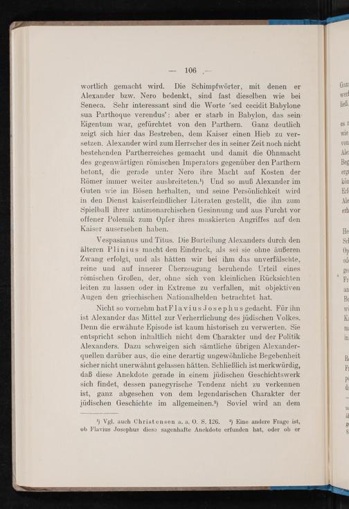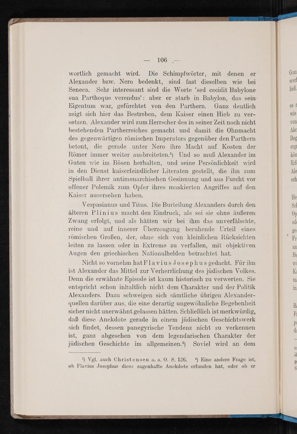 offener Polemik zum Opfer ihres maskierten Angriffes auf den Kaiser ausersehen haben. He Vespasianus und Titus. Die Burteilung Alexanders durch den Sch älteren Plinius macht den Eindruck, als sei sie ohne äußeren Op Zwang erfolgt, und als hätten wir bei ihm das unverfälschte, 0dl reine und auf innerer Überzeugung beruhende Urteil eines ge römischen Großen, der, ohne sich von kleinlichen Rücksichten FPr; leiten zu lassen oder in Extreme zu verfallen, mit objektiven an Augen den griechischen Nationalhelden betrachtet hat. B Nicht so vornehm hat Flavius Josephus gedacht. Für ihn wi ist Alexander das Mittel zur Verherrlichung des jüdischen Volkes. K. Denn die erwähnte Episode ist kaum historisch zu verwerten. Sie m. entspricht schon inhaltlich nicht dem Charakter und der Politik in
