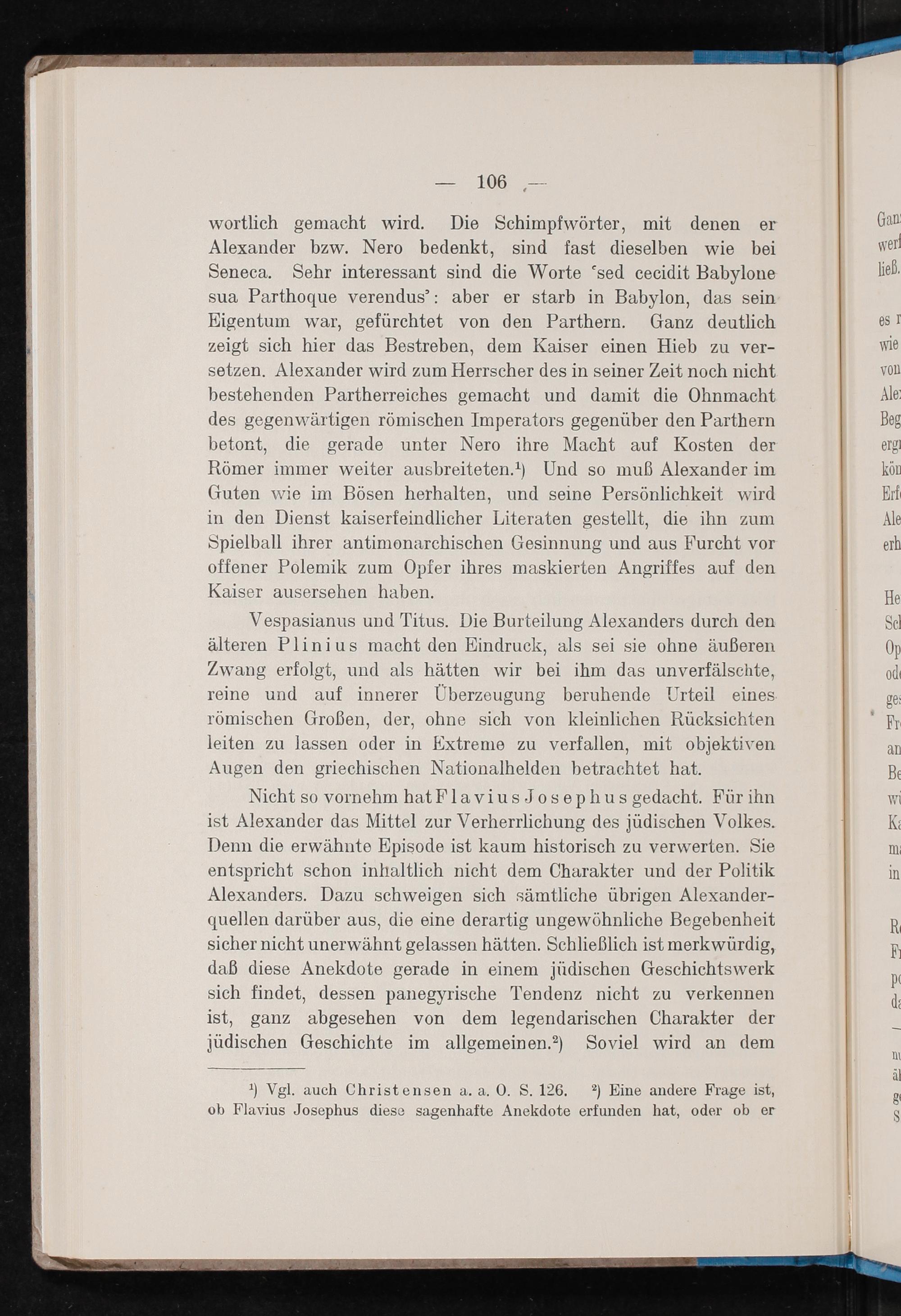Alexanders. Dazu schweigen sich sämtliche übrigen Alexander- quellen darüber aus, die eine derartig ungewöhnliche Begebenheit R sicher nicht unerwähnt gelassen hätten. Schließlich ist merkwürdig, 1 daß diese Anekdote gerade in einem jüdischen Geschichtswerk 1 sich findet, dessen panegyrische Tendenz nicht zu verkennen— ist, ganz abgesehen von dem legendarischen Charakter der jüdischen Geschichte im allgemeinen.²) Soviel wird an dem 1 1 ¹) Vgl. auch Christensen a. a. O. S. 126. ²) Eine andere Frage ist, g ob Flavius Josephus diese sagenhafte Anekdote erfunden hat, oder ob er 8