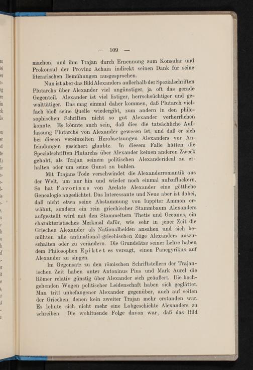 Im Gegensatz zu den römischen Schriftstellern der Trajan- ischen Zeit haben unter Antoninus Pius und Mark Aurel die Römer relativ günstig über Alexander sich geäußert. Die hoch- gehenden Wogen politischer Leidenschaft haben sich geglättet. Man tritt unbefangener Alexander gegenüber, auch auf seiten der Griechen, denen kein zweiter Trajan mehr erstanden war. Es lohnte sich nicht mehr eine Lobgeschichte Alexanders zu schreiben. Die wohltuende Folge davon war, daß das Bild