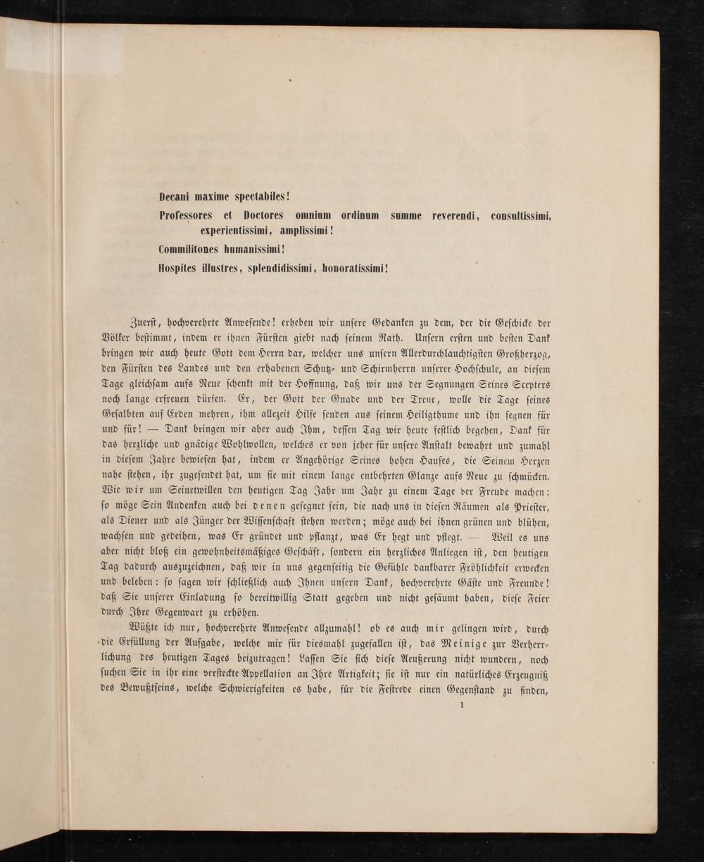 Zuerſt, hochverehrte Anweſende! erheben wir unſere Gedanken zu dem, der die Geſchicke der Völker beſtimmt, indem er ihnen Fürſten giebt nach ſeinem Rath. Unſern erſten und beſten Dank bringen wir auch heute Gott dem Herrn dar, welcher uns unſern Allerdurchlauchtigſten Großherzog, den Fürſten des Landes und den erhabenen Schutz⸗ und Schirmherrn unſerer Hochſchule, an dieſem Tage gleichſam aufs Neue ſchenkt mit der Hoffnung, daß wir uns der Segnungen Seines Scepters noch lange erfreuen dürfen. Er, der Gott der Gnade und der Treue, wolle die Tage ſeines Geſalbten auf Erden mehren, ihm allezeit Hilfe ſenden aus ſeinem Heiligthume und ihn ſegnen für und für!— Dank bringen wir aber auch Ihm, deſſen Tag wir heute feſtlich begehen, Dank für das herzliche und gnädige Wohlwollen, welches er von jeher für unſere Anſtalt bewahrt und zumahl in dieſem Jahre bewieſen hat, indem er Angehörige Seines hohen Hauſes, die Seinem Herzen nahe ſtehen, ihr zugeſendet hat, um ſie mit einem lange entbehrten Glanze aufs Neue zu ſchmücken. Wie wir um Seinetwillen den heutigen Tag Jahr um Jahr zu einem Tage der Freude machen: ſo möge Sein Andenken auch bei denen geſegnet ſein, die nach uns in dieſen Räumen als Prieſter, als Diener und als Jünger der Wiſſenſchaft ſtehen werden; möge auch bei ihnen grünen und blühen, wachſen und gedeihen, was Er gründet und pflanzt, was Er hegt und pflegt.— Weil es uns aber nicht bloß ein gewohnheitsmäßiges Geſchäft, ſondern ein herzliches Anliegen iſt, den heutigen Tag dadurch auszuzeichnen, daß wir in uns gegenſeitig die Gefühle dankbarer Fröhlichkeit erwecken und beleben: ſo ſagen wir ſchließlich auch Ihnen unſern Dank, hochverehrte Gäſte und Freunde! daß Sie unſerer Einladung ſo bereitwillig Statt gegeben und nicht geſäumt haben, dieſe Feier durch Ihre Gegenwart zu erhöhen.