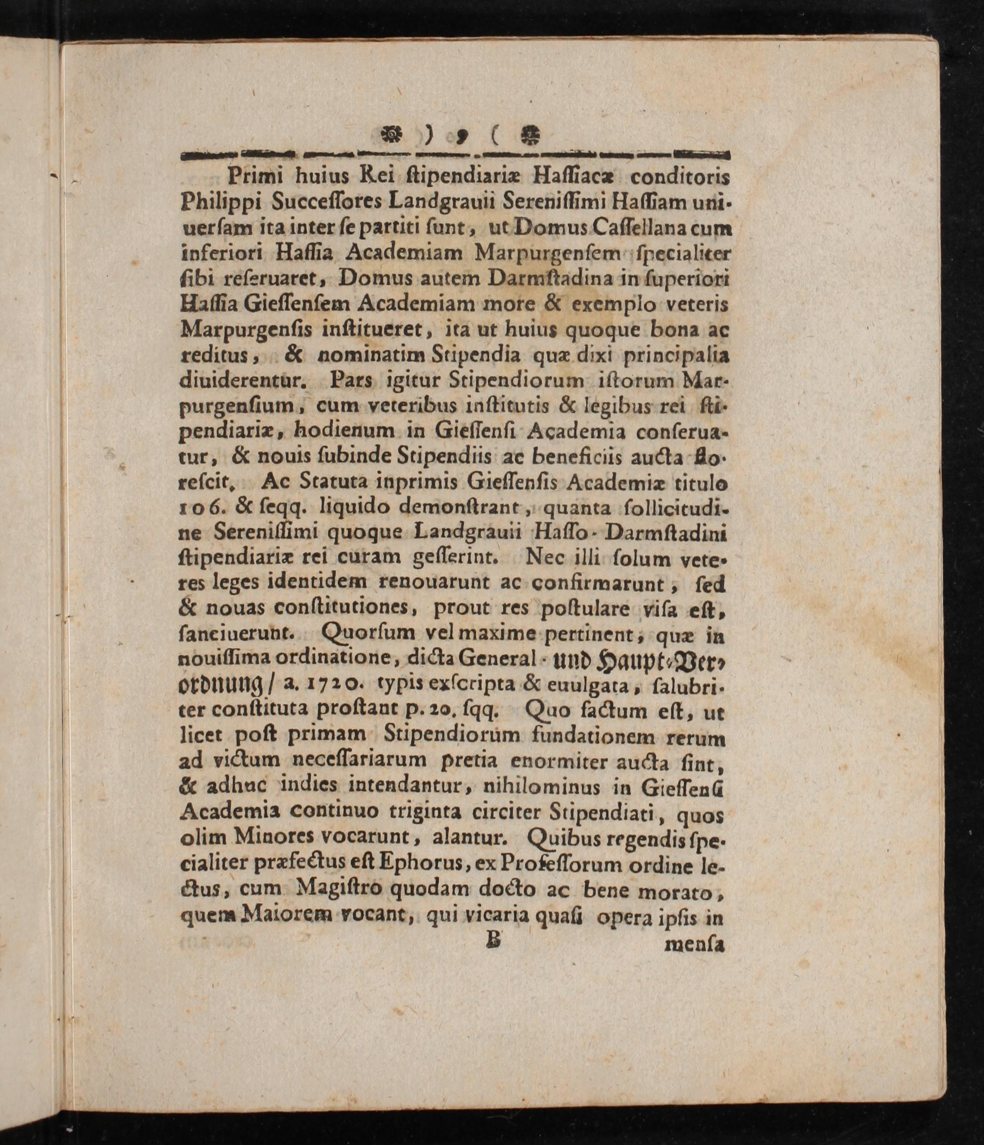 —————— Primi huius Kei ſtipendiariæ Haſſiacæ conditoris Philippi Succeſſores Landgrauii Sereniſſimi Haſſiam uni- uerſam ita inter ſe partiti ſunt, ut Domus Caſſellana cum inferiori Hafſia Academiam Marpurgenſem ſpecialiter ſibi reſeruaret, Domus autem Darmſtadina in ſuperiori Haſſia Gieſſenſem Academiam more& exemplo veteris Marpurgenſis inſtitueret, ita ut huius quoque bona ac reditus,& nominatim Stipendia quæ dixi principalia diuiderentur. Pars igitur Stipendiorum iſtorum Mar- purgenſium, cum veteribus inſtitutis& legibus rei ſti- pendiariæ, hodienum in Gieſſenſi Academia conſerua- tur,& nouis ſubinde Stipendiis ac beneficiis aucta fo reſcit. Ac Statuta inprimis Gieſſenſis Academiæ titulo 106.& ſeqq. liquido demonſtrant, quanta ſollicitudi- ne Sereniſſimi quoque Landgrauii Haſſo- Darmſtadini ſtipendiariæ rei curam geſſerint. Nec illi ſolum vete- res leges identidem renouarunt ac confirmarunt, ſed & nouas conſtitutiones, prout res poſtulare viſa eſt, ſanciuerunt. Quorſum vel maxime pertinent, quæ in nouiſſima ordinatione, dicta General- und Haupt⸗Ver⸗ ordnung/ a. 1720. typis exſcripta& euulgata, ſalubri- ter conſtituta proſtant p. 20. ſqq. Quo ſactum eſt, ut licet poſt primam Stipendiorum fundationem rerum ad victum neceſſariarum pretia enormiter aucta fint, & adhuc indies intendantur, nihilominus in Gieſſené Academia continuo triginta circiter Stipendiati, quos olim Minores vocarunt, alantur. Quibus regendis ſpe · cialiter præfectus eſt Ephorus, ex Profeſſorum ordine le- ctus, cum Magiſtro quodam docto ac bene morato, quem Maiorem vocant, qui vicaria quaſi opera ipſis in B menſa