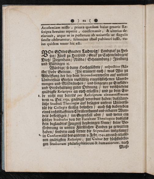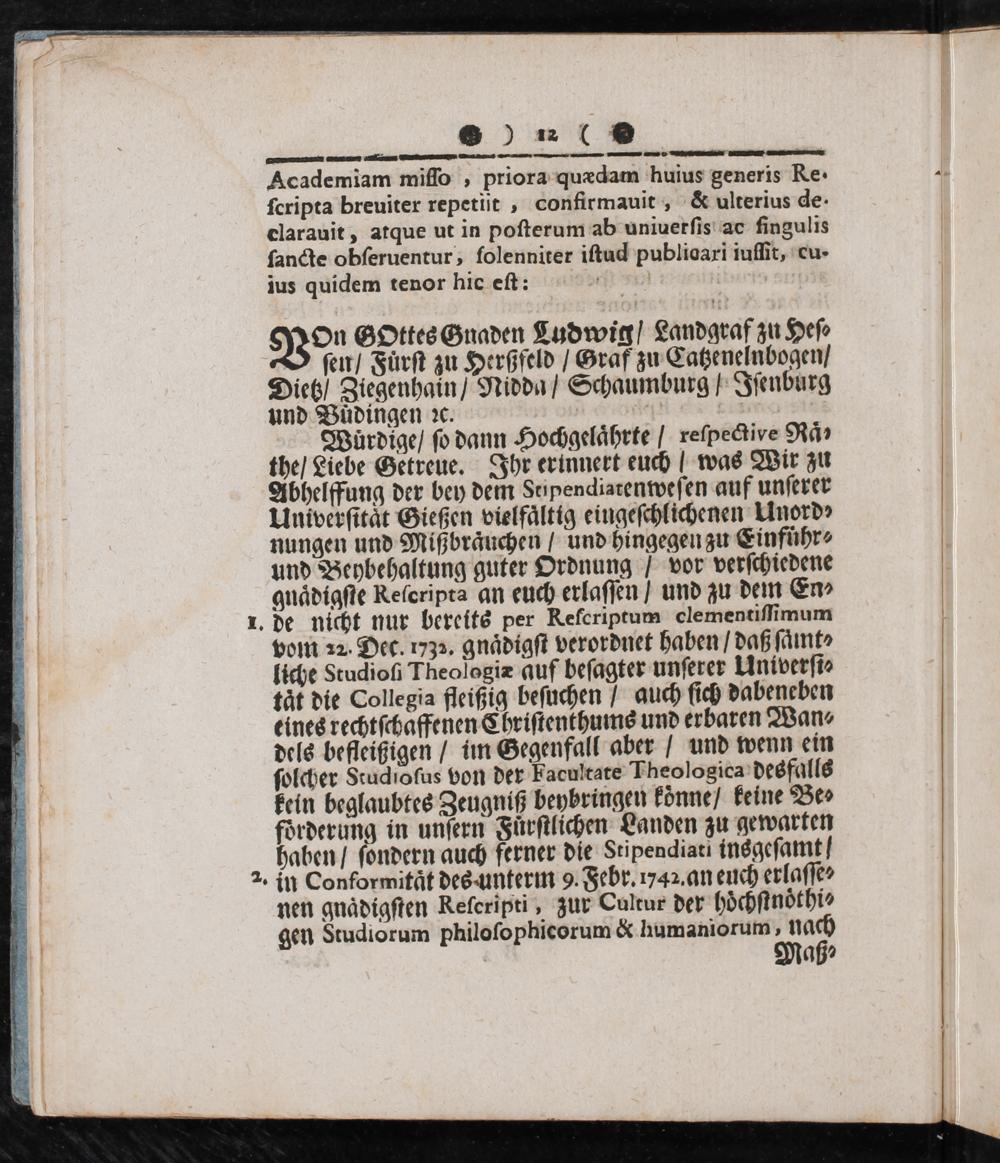 Wäͤrdige/ ſo dann Hochgelaͤhrte/ reſpective Raͤ⸗ the/ Liebe Getreue. Ihr erinnert euch/ was Wir zu Abhelffung der bey dem Seipendiatenweſen auf unſerer Univerſitaͤt Gießen vielfaͤltig eingeſchlichenen Unord⸗ nungen und Mißbraͤuchen/ und hingegen zu Einfuͤhr⸗ und Beybehaltung guter Ordnung/ vor verſchiedene gnaͤdigſte Reſcripta an euch erlaſſen/ und zu dem En⸗ 1 1. de nicht nur bereits per Keferiptum clementiſſimum 1 vom 22. Dec. 1732. gnaͤdigſt verordnet haben/ daß ſaͤmt⸗ 3 liche Studioſi Theologiæ auf beſagter unſerer Univerſi⸗ 1 taͤt die Collegia fleißig beſuchen/ auch ſich dabeneben