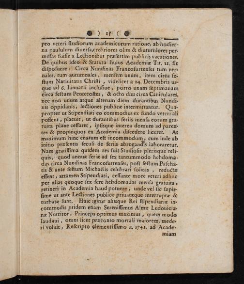 G) 1†( ●. —————— pro veteri ſtudiorum academicorum ratione, ab hodier- na paululum diuerſa, crebriores olim& diuturniores per- miſſas fuiſſe a Lectionibus præſertim publicis vacationes. De quibus ideo& Statuta huius Academiæ Tit. z1. fic diſpoſuere: Cirea Nundinas Francofurtenſes tum ver- nales, tum autumnales, menſem unum, item circa fe- ſtum Natiuitatis Chriſti, videlicet a 24. Decembris us- ue ad 6. lanuarii incluſiue, porro unam ſeprimanam circa feſtum Pentecoſtes,& octo dies circa Caniculares, nec non unum atque alterum diem durantibus Nundi- nis oppidanis, lectiones publicæ intermittantur. Qua- propter ut Stipendiati eo eommodius ex fundo veteri ali poſſent, placuit, ut durantibus feriis menſa eorum gra- tuita plane ceffaret, ipſisque interea domum ad paren- tes& propinquos ex Acedemia diſcedere liceret. At maximum hinc enatum eſt incommodum, cum inde ab initio præſentis ſeculi de feriis abrogandis laboraretur. Nam gratiſſima quidem res fuiĩt Studioſis plerisque reli- quis, quod annuæ feriæ ad ſex tantummodo hebdoma das circa Nundinas Francofurtenſes, poſt feſtum Paſcha- tis& ante feſtum Michaélis celebrari ſolitas, reductæ efſent, attamen Stipendiati, ceſſante more veteri adhue per alias quoque ſex fere hebdomadas menſa gratuita, retineri in Academia haud potuere, unde vel ſic ſæpis- fime ut ante Lectiones publicæ priuatæque interruptæ& turbatæ ſunt. Huic igitur aliisque Rei ſtipendiariæ in- commodis pridem etiam Serenifſimus Almæ Ludouicia- næ Nutritor, Princeps optimus maximus, quem modo laudaui, omni licet præconio mortali maiorem, mede- ri voluit, Reſcripto glementiſſimo a. 1741. ad Acade- miam
