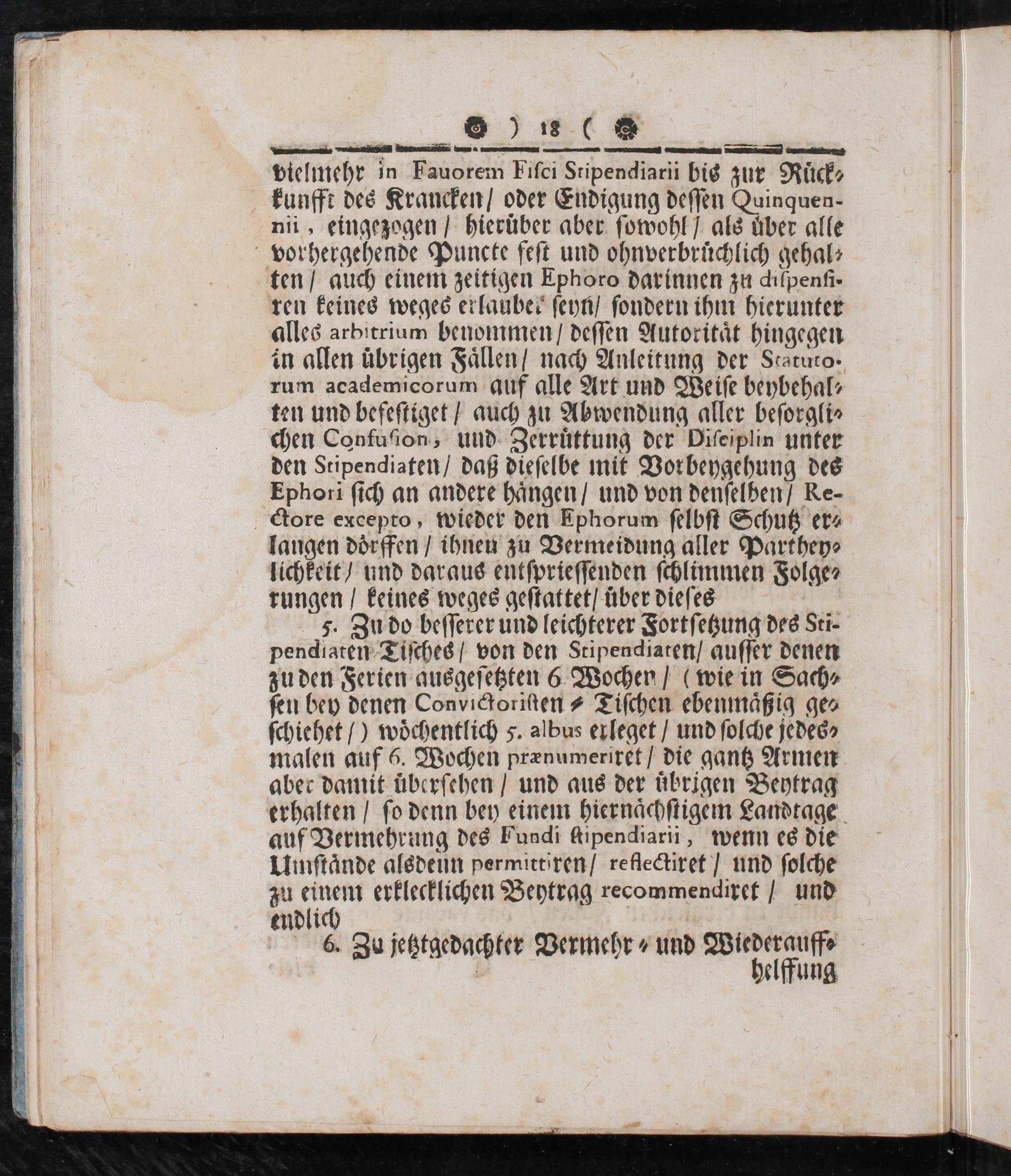 lichkeit/ und daraus entſprieſſenden ſchlimmen Folge⸗ rungen/ keines weges geſtattet/ uͤber dieſes 5. Zu do beſſerer und leichterer Fortſetzung des Sti⸗ pendiaten Tiſches/ von den Stipendiaten/ auſſer denen zu den Ferien ausgeſetzten 6 Wochen/(wie in Sach⸗ ſen bey denen Convictoriſten⸗Tiſchen ebenmaͤßig ge⸗ ſchiehet /) woͤchentlich 5. albus erleget/ und ſolche jedes⸗ malen auf 6. Wochen prænumeriret/ die gantz Armen aber damit uͤberſehen/ und aus der uͤbrigen Beytrag erhalten/ ſo denn bey einem hiernaͤchſtigem Landtage auf Vermehrung des Fundi ſtipendiarii, wenn es die Umſtaͤnde alsdenn permittiren/ reflectiret/ und ſolche zu ewem erklecklichen Beytrag recommendiret/ und endli 6. Za jetztgedachter Vermehr“ und Wiederauff⸗ helffung