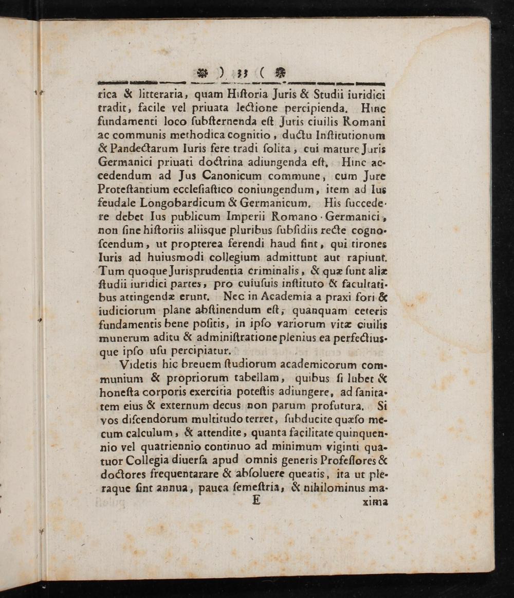 rica& litteraria, quam Hiſtoria Juris Studii iuridici tradit, facile vel priuata lectione percipienda. Hinc fundamenti loco ſubſternenda eſt Juris ciuilis Romani ac communis methodica cognitio, ductu Inſtitutionum & Pandectarum luris fere tradi ſolita, cui mature Juris⸗ Germanici priuati doctrina adiungenda eſt. Hine ac- cedendum ad Jus Canonicum commune, cum Jure Proteſtantium eccleſiaſtico coniungendum, item ad lus feudale Longobardicum& Germanicum. His ſuccede. re debet Ius publicum Imperii Romano Germanici, non ſine hiſtoriis aliisque pluribus ſubſidiis recte cogno- ſcendum, ut propterea ferendi haud fint, qui tirones luris ad huiusmodi collegium admittunt aut rapiunt.