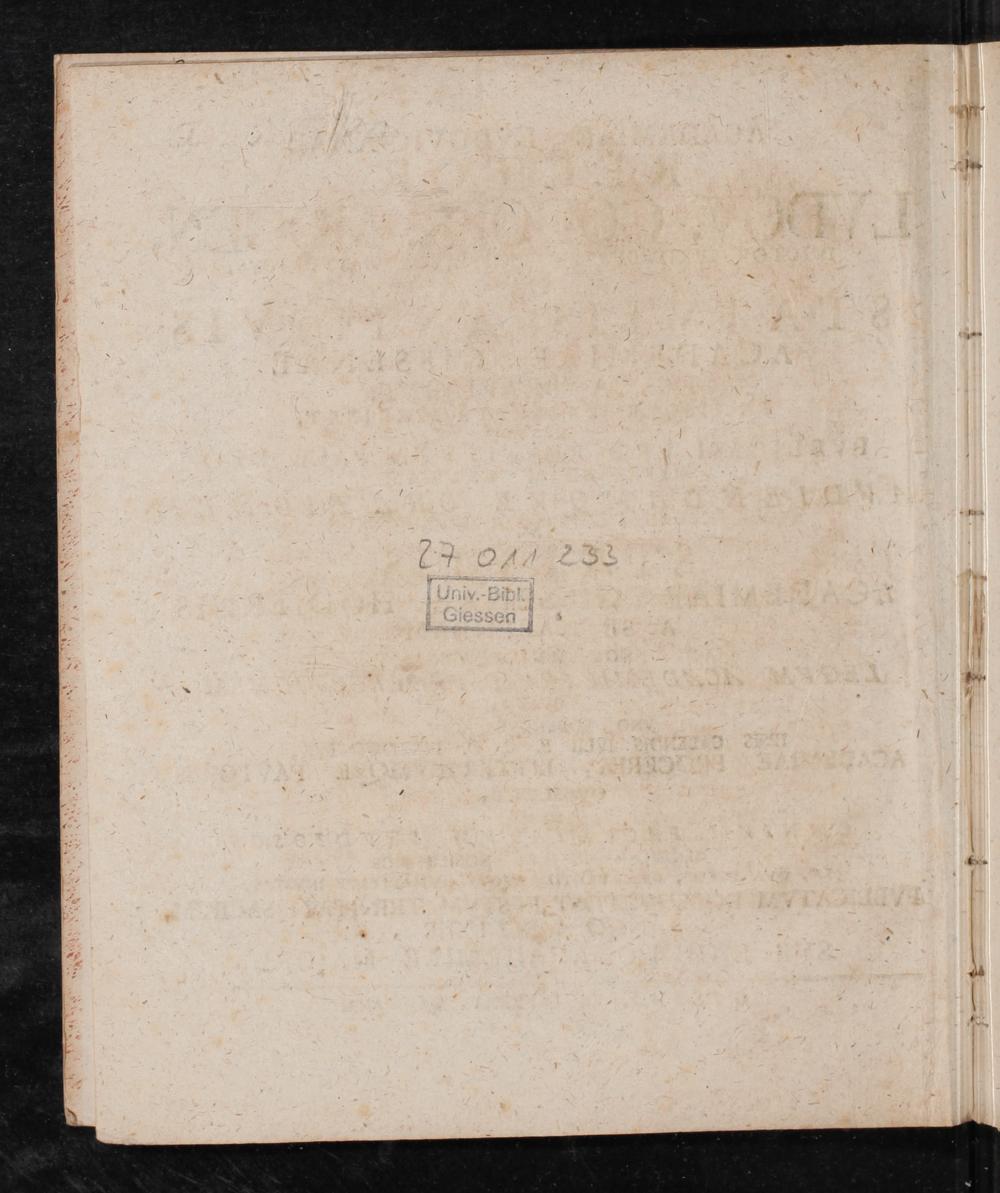 Academiae Lvdovicianae Rector Lvdov. Godofr. Mogen Doctor ivridicvs et Professor Historicvs , de Statvtis Antiqvis Academiae Gissenae Pavca Praelibat, Ex Iisqve Excerpta Exhibet, et ad Pvblicam Pro Restitvta Pace Deo Referendam Gratiam Avdiendamqve Orationem de Statvtis Academiae Gissenae Hodiernis a se Habendam Solemnemqve Legvm Academicarvm Praelectionem qvae Vno Eodemqve Actv Ipsis Calendis Ivlii B.C.D. Institventvr, Academiae Proceres, Literatvmqve Favtores Qvoslibet, Item Omnivm Facvltatvm Stvdiosos Generosissimos et Nobilissimos ea, Qva Decet, Observantia Atqve Hvmanitate Invitat. Pvblicatvm Dom. IV. Post Festvm Trinitati Sacrvm, Anno MDCCLXIII. Sub Sigillo Academiae Maiori. / Ludov. Godofr. Mogen