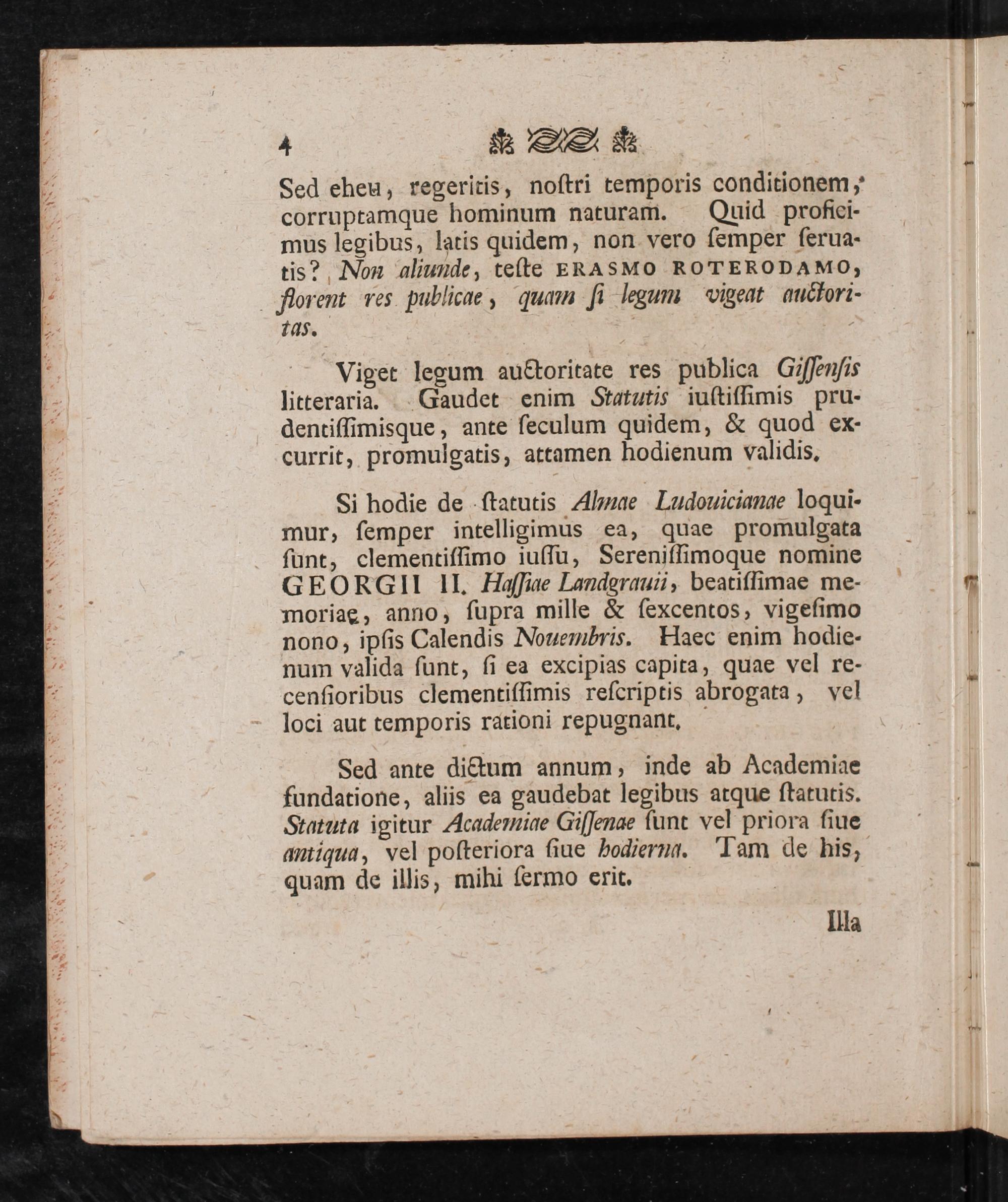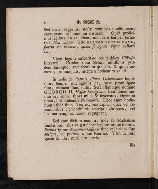 Sed ante dictum annum, inde ab Academiae fundatione, aliis ea gaudebat legibus atque ſtatutis. Statuta igitur Academiae Giſſenae ſunt vel priora ſiue antiqua, vel poſteriora ſiue hodiern. Tam de his, quam de illis, mihi ſermo erit.
