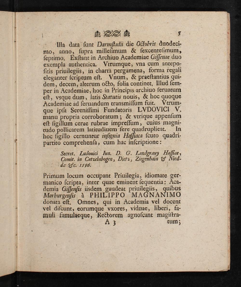Illa data ſunt Daruſtadi die Octobris duodeci- mo, anno, ſupra milleſfimum& ſexcenteſimum, ſeptimo. Exſtant in Archiuo Academiae Giſſenae duo exempla authentica. Vtrumque, vna cum antepo- ſitis priuilegiis, in charta pergamena, forma regali eleganter ſcriptum eſt. Vnum,& praeſtantius qui- dem, decem, alterum octo, folia continet. Illud ſem- per in Academiae, hoc in Principis archiuo ſeruatum eſt, vsque dum, latis Statutis nouis,& hoc quoque Academiae ad ſeruandum transmiſſum fuit. Vtrum. que ipſa Sereniſſimi Fundatoris LVDOVICI V. manu propria corroboratum;& vtrique appenſum eſt ſigillum cerae rubrae impreſſum, cuius magni- tudo pollicarem latitudiuem fere quadruplicat. In hoc ſigillo cernuntur inſignia Haſſiaca ſcuto quadri- partito comprehenſa, cum hac inſcriptione: