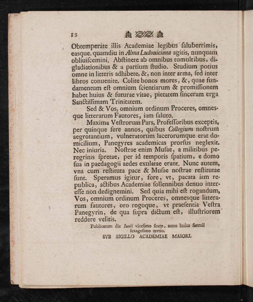Obtemperate illis Academiae legibus ſaluberrimis, easque, quamdiu in Alma Ludouiciana agitis, nunquam obliuiſcemini. Abſtinete ab omnibus tumultibus, di- gladiationibus& a partium ſtudio. Studium potius omne in litteris adhibete,&, non inter arma, ſed inter libros conuenite. Colite bonos mores,&, quae fun- damentum eſt omnium ſcientiarum& promiſſionem habet huius& futurae vitae, pietatem ſinceram erga Santtiſſimam Trinitatem.