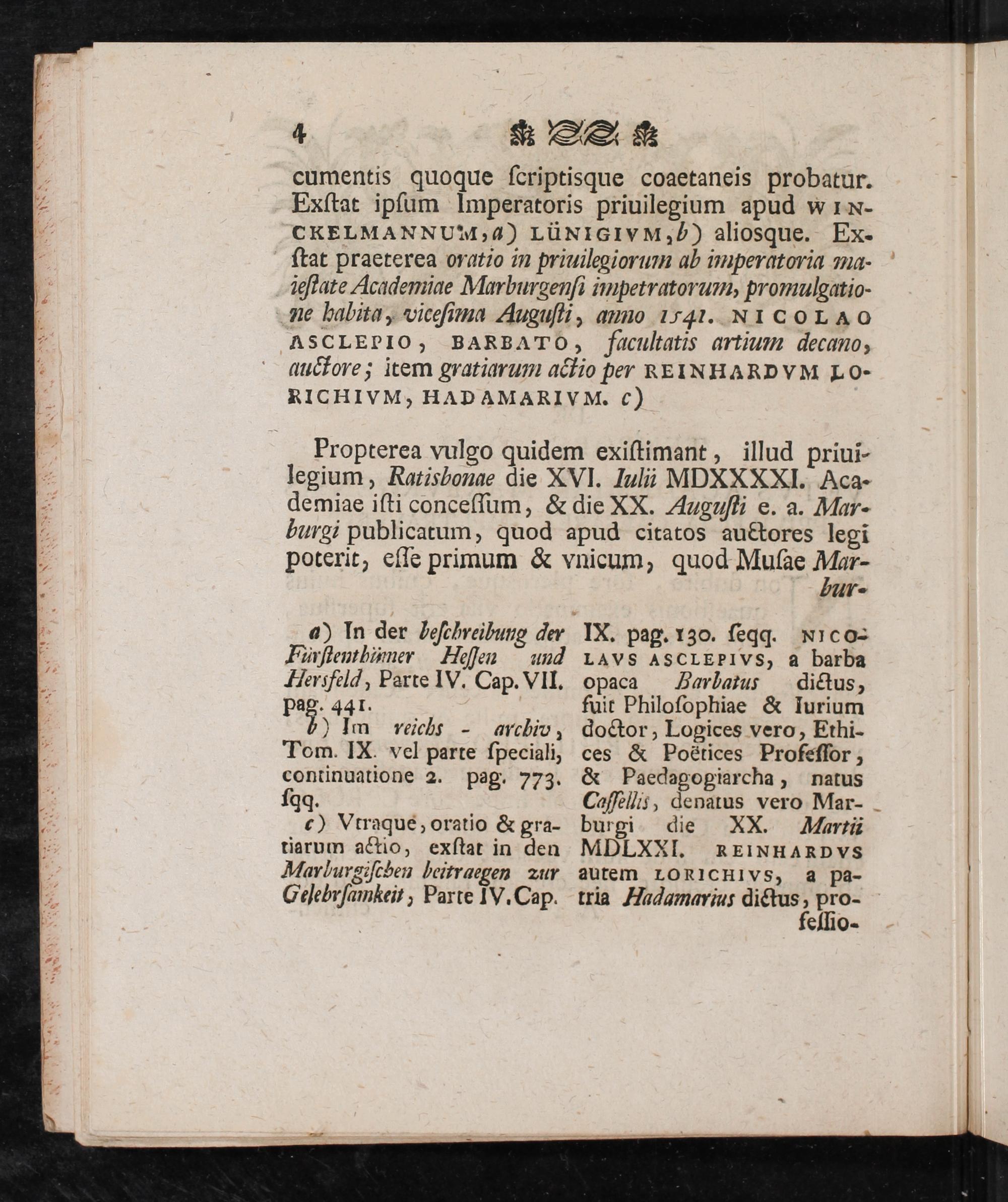 cumentis quoque ſcriptisque coaetaneis probatur. Exſtat ipſum Imperatoris priuilegium apud w IN- CKELMANNUNM, a) LüNIGIVM, SB) aliosque. Ex- ſtat praeterea oratio in priuilegiorun ab imperatoria ma- eſtate Academiae Marburgenſi impetratorum, promulgatio- ne babita, viceſima Auguſti, anno Iqt. NICOEAO AsSCLEPIO, BARBATO, facultatis artium decano, auctore; item gratiarum actio per REINHARPDVM Lo- RICHIVM, HADAMARIVM. c)