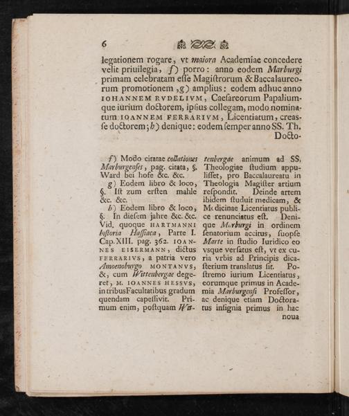 tenbergae animum ad 88. Theologiae ſtudium appu- liſſet, pro Baccalaureatu in Theologia Magiſter artium reſpondit. Deinde artem ibidem ſtuduit medicam,& ML dicinae Licentiatus publi- ce renunciatus eſt. Deni- que Marburgi in ordinem ſenatorium accitus, ſuopſe Marte in ſtudio Iuridico eo vsque verſatus eſt, vt ex cu- ria vrbis ad Principis dica- ſterium translatus ſit. Po- ſtremo iurium Licentiatus, eorumque primus in Acade- mia Marburgenſi Profeſſor, ac denique etiam Doctora- tus inſignia primus in hac noua