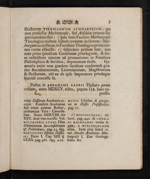 & SS. K 7 Doctorem TILEMANNVM SCHNABELIVM, qui non profeſſor Marburbenſis, ſed Alsfeldiae primus Su- perintendens fuit,(quia tunc Facultas Marburgenſis Theologica nullum habuit creatum doctorem) Mar- burgum accerſitum, in Facultate Theologica promotio- nes varias effeciſſe: i) ſuſpicatus pridem ſum, iam tum prius quoddam Caeſareum priuilegium,& for- te reſtrictum tantum ad promotiones in Facultate Philoſophica& Iuridica, impetratum fuiſſe. Gy- mnaſia enim non gaudent facultate conferendi gra- dus Baccalaureorum, Licentiatorum, Magiſtrorum & Doctorum, niſi ea ab ipſo Imperatore priuilegio ſpeciali conceſſa ſit.