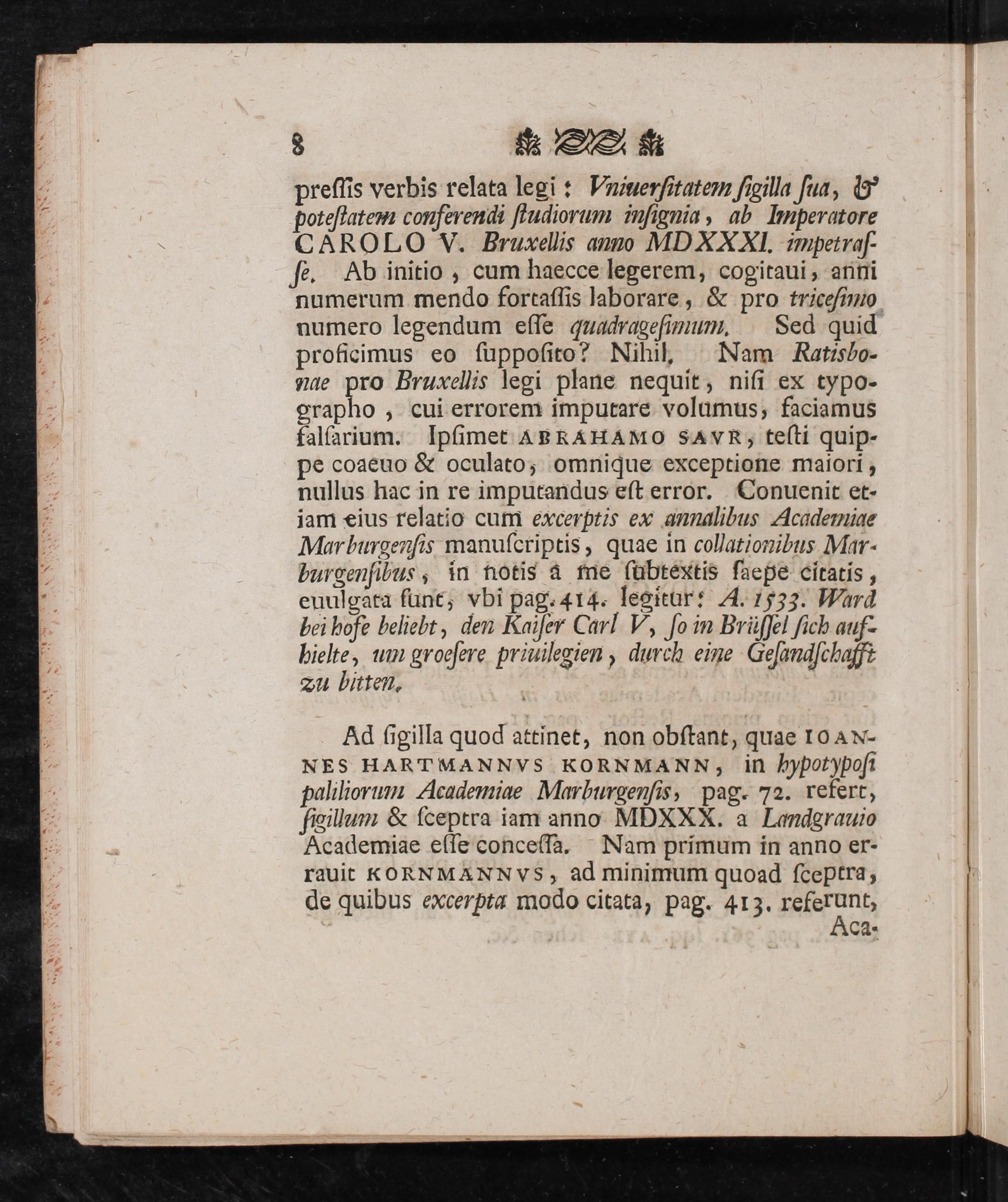 Ad ſigilla quod attinet, non obſtant, quae Ioax-- NFES HARTMANNVS KORNMANN, in hHpot)poſi paliliorum Academiae Marburgenſis, pag. 72. refert, ſwillum& ſceptra iam anno MDXXX. a Landgrauio Academiae eſſe conceſſa. Nam primum in anno er- rauit KoRNMANNVS, ad minimum quoad ſceptra, de quibus excerpta modo citata, pag. 413. referunt, ca-