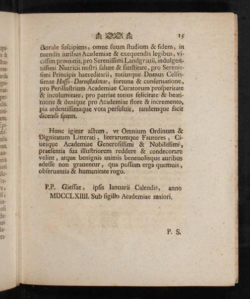 P.P. Gieſſae, ipſis Januarii Calendis, anno MDCCLXIIII. Sub ſigillo Academiae maiori.