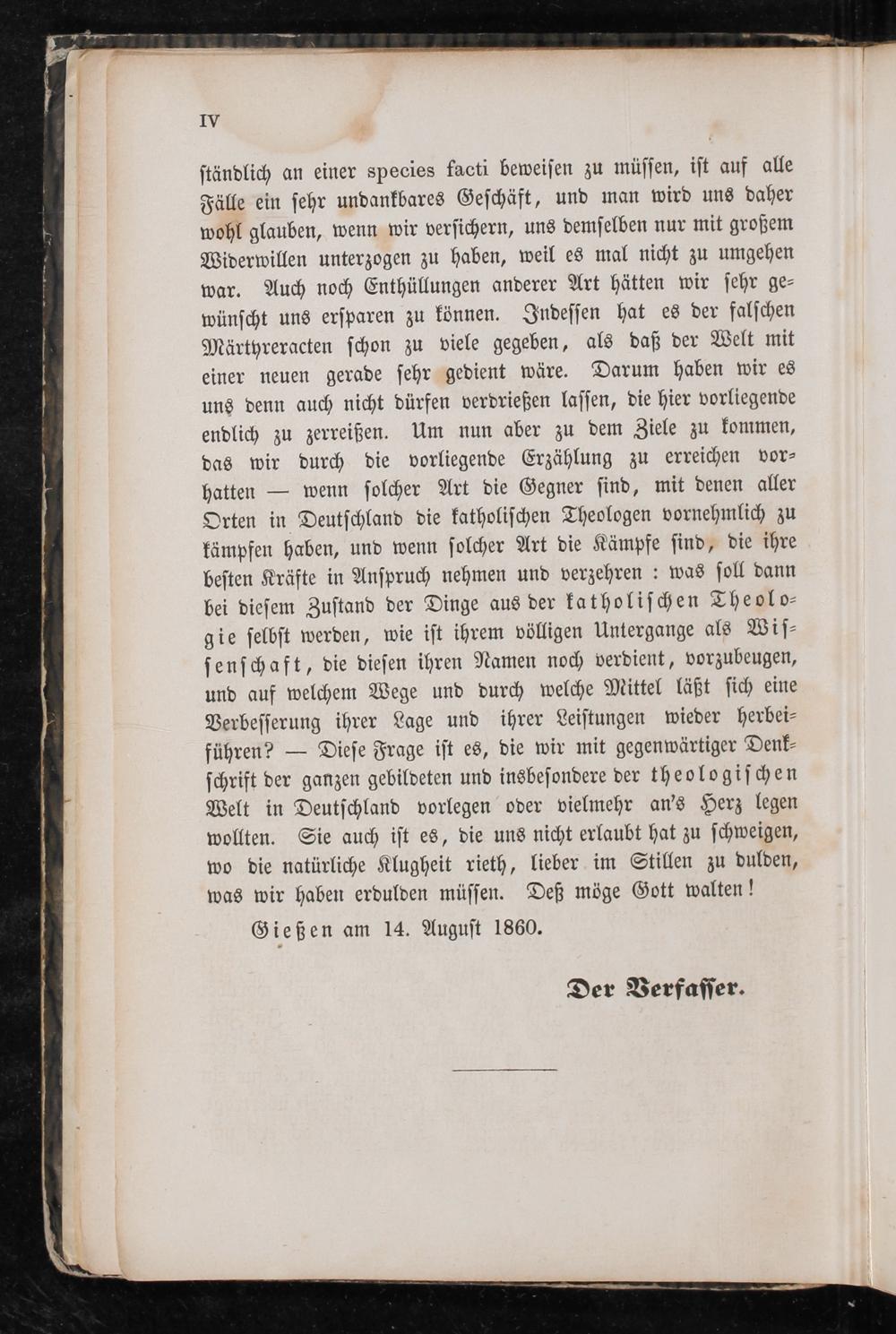 ſtändlich an einer species facti beweiſen zu müſſen, iſt auf alle Fälle ein ſehr undankbares Geſchäft, und man wird uns daher wohl glauben, wenn wir verſichern, uns demſelben nur mit großem Widerwillen unterzogen zu haben, weil es mal nicht zu umgehen war. Auch noch Enthüllungen anderer Art hätten wir ſehr ge⸗ wünſcht uns erſparen zu können. Indeſſen hat es der falſchen Märtyreracten ſchon zu viele gegeben, als daß der Welt mit einer neuen gerade ſehr gedient wäre. Darum haben wir es uns denn auch nicht dürfen verdrießen laſſen, die hier vorliegende endlich zu zerreißen. Um nun aber zu dem Ziele zu kommen, das wir durch die vorliegende Erzählung zu erreichen vor⸗ hatten— wenn ſolcher Art die Gegner ſind, mit denen aller Orten in Deutſchland die katholiſchen Theologen vornehmlich zu kämpfen haben, und wenn ſolcher Art die Kämpfe ſind, die ihre beſten Kräfte in Anſpruch nehmen und verzehren: was ſoll dann bei dieſem Zuſtand der Dinge aus der katholiſchen Theolo⸗ gie ſelbſt werden, wie iſt ihrem völligen Untergange als Wiſ⸗ ſenſchaft, die dieſen ihren Namen noch verdient, vorzubeugen, und auf welchem Wege und durch welche Mittel läßt ſich eine Verbeſſerung ihrer Lage und ihrer Leiſtungen wieder herbei⸗ führen?— Dieſe Frage iſt es, die wir mit gegenwärtiger Denk⸗ ſchrift der ganzen gebildeten und insbeſondere der theologiſchen Welt in Deutſchland vorlegen oder vielmehr an's Herz legen wollten. Sie auch iſt es, die uns nicht erlaubt hat zu ſchweigen, wo die natürliche Klugheit rieth, lieber im Stillen zu dulden, was wir haben erdulden müſſen. Deß möge Gott walten!