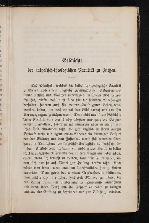 Das Schickſal, welches die katholiſch⸗theologiſche Facultät zu Gießen nach einem ungefähr zwanzigjährigen blühenden Be⸗ ſtande plötzlich und Manchen unerwartet um Oſtern 1851 betrof fen hat, dürfte wohl nicht blos für die früheren Angehörigen derſelben, ſondern auch für weitere Kreiſe genug Beherzigens⸗ werthes haben, um noch einmal den Blick darauf und das ihm Vorangegangene zurückzuwenden. Denn nicht nur iſt die Geſchichte dieſer Facultät eine bereits abgeſchloſſene und ganz der Vergan⸗ genheit zugefallene, ſodaß ſie ſich immerhin ſchon in ein hiſtori⸗ ſches Bild einrahmen läßt: ſie gibt zugleich in ihrem ganzen Verlaufe mehr wie irgend etwas Anderes ein lebendiges Beiſpiel von der Stellung und dem Zuſtande, worin ſich dermalen über haupt in Deutſchland die katholiſch⸗theologiſche Wiſſenſchaft be⸗ findet. Freilich rollt ſich damit ein nicht gerade überall in hellen Farben ausgeführtes Gemälde vor unſeren Augen auf; aber ſchon, eines Uebels ſich bewußt zu werden, kann ſein Gutes haben, in⸗ dem ſich nur ſo auf Mittel zur Heilung denken läßt. Auch würde man irren, wenn man nur Unerfreuliches hier zu finden erwartete. Denn gewiß hat es etwas Erhebendes, in ſchlimmer, man möchte ſagen troſtloſer, Zeit edele Männer zu finden, die den Kampf gegen faſt unüberwindliche Hinderniſſe aufnahmen und durch ihren Muth und ihr Geſchick es dahin zu bringen wußten, eine Stiftung zu begründen und zur Blüthe zu erheben,