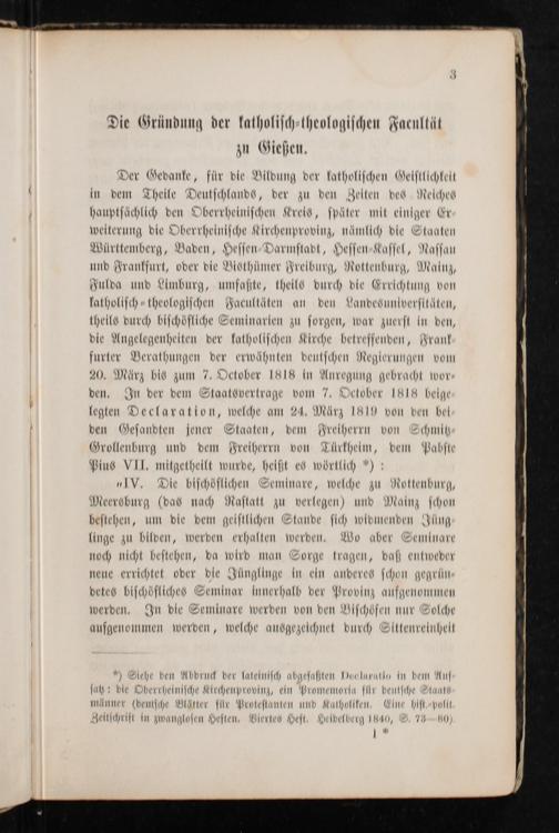 Der Gevanke, für die Bildung der katholiſchen Geiſtlichkeit in dem Theile Deutſchlands, der zu den Zeiten des Reiches hauptſächlich den Oberrheiniſchen Kreis, ſpäter mit einiger Er weiterung die Oberrheiniſche Kirchenprovinz, nämlich die Staaten Württemberg, Baden, Heſſen⸗Darmſtadt, Heſſen⸗Kaſſel, Naſſau und Frankfurt, oder die Bisthümer Freiburg, Rottenburg, Mainz, Fulda und Limburg, umfaßte, theils durch die Grrichtung von katholiſch⸗theologiſchen Facultäten an den Landesuniverſitäten, theils durch biſchöfliche Seminarien zu ſorgen, war zuerſt in den, die Angelegenheiten der katholiſchen Kirche betreffenden, Frank furter Berathungen der erwähnten deutſchen Regierungen vom 20. März bis zum 7. October 1818 in Anregung gebracht won