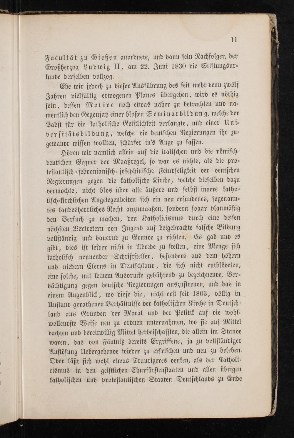 Hören wir nämlich allein auf die italiſchen und die römiſch⸗ deutſchen Gegner der Maaßregel, ſo war es nichts, als die pro⸗ teſtantiſch⸗febronianiſch⸗joſephiniſche Feindſeligkeit der deutſchen Regierungen gegen die katholiſche Kirche, welche dieſelben dazu vermochte, nicht blos über alle äußere und ſelbſt innere katho⸗ liſch⸗kirchlichen Angelegenheiten ſich ein neu erfundenes, ſogenann⸗ tes landesherrliches Recht anzumaaßen, ſondern ſogar planmäßig den Verſuch zu machen, den Katholicismus durch eine deſſen nächſten Vertretern von Jugend auf beigebrachte falſche Bildung vollſtändig und dauernd zu Grunde zu richten. Es gab und es gibt, dies iſt leider nicht in Abrede zu ſtellen, eine Menge ſich katholiſch nennender Schriftſteller, beſonders aus dem höhern und niedern Clerus in Deutſchland, die ſich nicht entblödeten, eine ſolche, mit keinem Ausdrucke gebührend zu bezeichnende, Ver⸗ dächtigung gegen deutſche Regierungen auszuſtreuen, und das in einem Augenblick, wo dieſe die, nicht erſt ſeit 1803, völlig in Unſtand gerathenen Verhältniſſe der katholiſchen Kirche in Deutſch⸗ land aus Gründen der Moral und der Politik auf die wohl⸗ wollendſte Weiſe neu zu ordnen unternahmen, wo ſie auf Mittel dachten und bereitwillig Mittel herbeiſchafften, die allein im Stande waren, das von Fäulniß bereits Ergriffene, ja zu vollſtändiger Auflöſung Uebergehende wieder zu erfriſchen und neu zu beleben. Oder läßt ſich wohl etwas Traurigeres denken, als der Katholi⸗ cismus in den geiſtlichen Churfürſtenſtaaten und allen übrigen katholiſchen und proteſtantiſchen Staaten Deutſchlands zu Ende