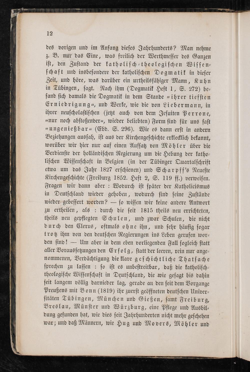 des vorigen und im Anfang dieſes Jahrhunderts? Man nehme z. B. nur das Eine, was freilich der Werthmeſſer des Ganzen iſt, den Zuſtand der katholiſch⸗theologiſchen Wiſſen⸗ ſchaft und insbeſondere der katholiſchen Dogmatik in dieſer Zeit, und höre, was darüber ein urtheilsfähiger Mann, Kuhn in Tübingen, ſagt. Nach ihm(Dogmatik Heft 1, S. 272) be⸗ fand ſich damals die Dogmatik in dem Stande„ihrer tiefſten Erniedrigungn, und Werke, wie die von Liebermann, in ihrer neuſcholaſtiſchen(jetzt auch von dem Jeſuiten Perrone, nnur noch abſtoßender“, wieder beliebten) Form ſind für uns faſt „ungenießbar⸗(Ebd. S. 296). Wie es dann erſt in andern Beziehungen ausſah, iſt aus der Kirchengeſchichte erklecklich bekannt, worüber wir hier nur auf einen Aufſatz von Möhler über die Verdienſte der holländiſchen Regierung um die Hebung der katho⸗ liſchen Wiſſenſchaft in Belgien(in der Tübinger Quartalſchrift etwa um das Jahr 1827 erſchienen) und Scharpff' Neueſte Kirchengeſchichte(Freiburg 1852. Heft 2, S. 119 ff.) verweiſen. Fragen wir dann aber: Wodurch iſt ſpäter der Katholicismus in Deutſchland wieder gehoben, wodurch ſind ſeine Zuſtände wieder gebeſſert worden?— ſo wiſſen wir keine andere Antwort zu ertheilen, als: durch die ſeit 1815 theils neu errichteten, theils neu gepflegten Schulen, und zwar Schulen, die nicht durch den Clerus, oftmals ohne ihn, und ſehr häufig ſogar trotz ihm von den deutſchen Regierungen ins Leben gerufen wor⸗ den ſind!— Um aber in dem eben vorliegenden Fall ſogleich ſtatt aller Vorausſetzungen den Erfolg, ſtatt der leeren, rein nur ange⸗ nommenen, Verdächtigung die klare geſchichtliche Thatſache ſprechen zu laſſen: ſo iſt es unbeſtreitbar, daß die katholiſch⸗ theologiſche Wiſſenſchaft in Deutſchland, die wie geſagt bis dahin ſeit langem völlig darnieder lag, gerade an den ſeit dem Vorgange Preußens mit Bonn(1819) ihr zuerſt geöffneten deutſchen Univer⸗ ſitäten Trübingen, München und Gießen, ſamt Freiburg, Breslau, Münſter und Würzburg, eine Pflege und Ausbil⸗ dung gefunden hat, wie dies ſeit Jahrhunderten nicht mehr geſchehen war; und daß Männern, wie Hug und Movers, Möhler und