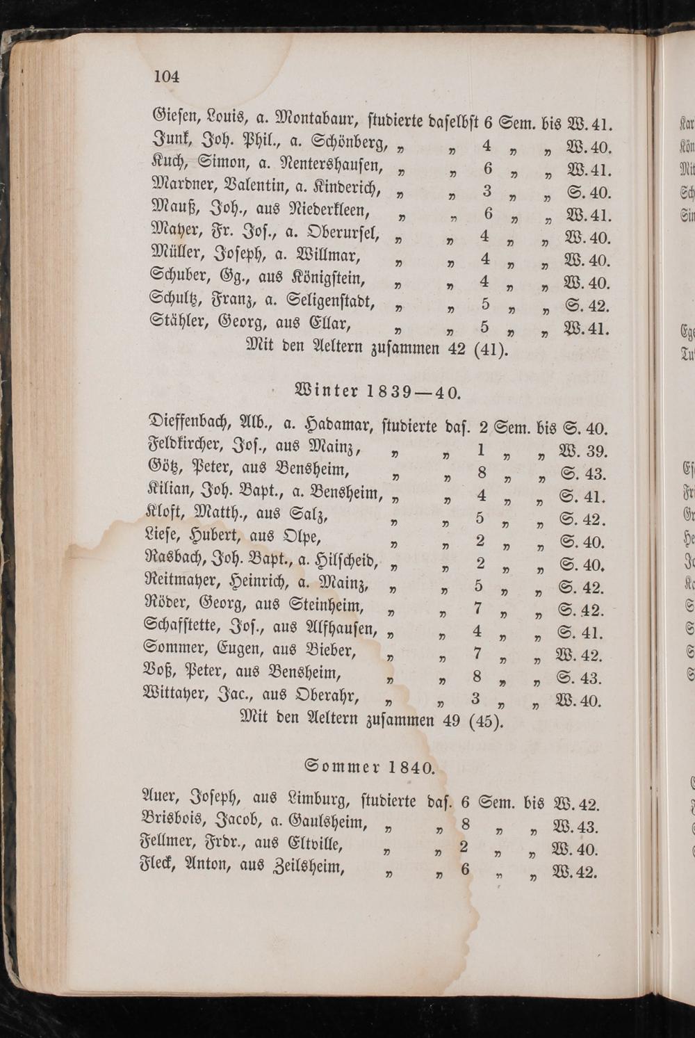 Junk, Joh. Phil., a. Schönberg,„„ 4„„ 2. 40. Kuch, Simon, a. Nentershauſen,„„ 6„„ W. 41. Mardner, Valentin, a. Kinderich,„„ 3„„ S. 40. Mauß, Joh., aus Niederkleen,„„ 6„„ W. 41. Mayer, Fr. Joſ., a. Oberurſel,„„ 4„„ W. 40. Müller, Joſeph, a. Willmar,„„ 4„„ W. 40. Schuber, Gg., aus Königſtein,„„ 4„„ W. 40. Schultz, Franz, a. Seligenſtadt,„„ 5„„ S. 42. Stähler, Georg, aus Ellar,„ 5„„ W. 41.