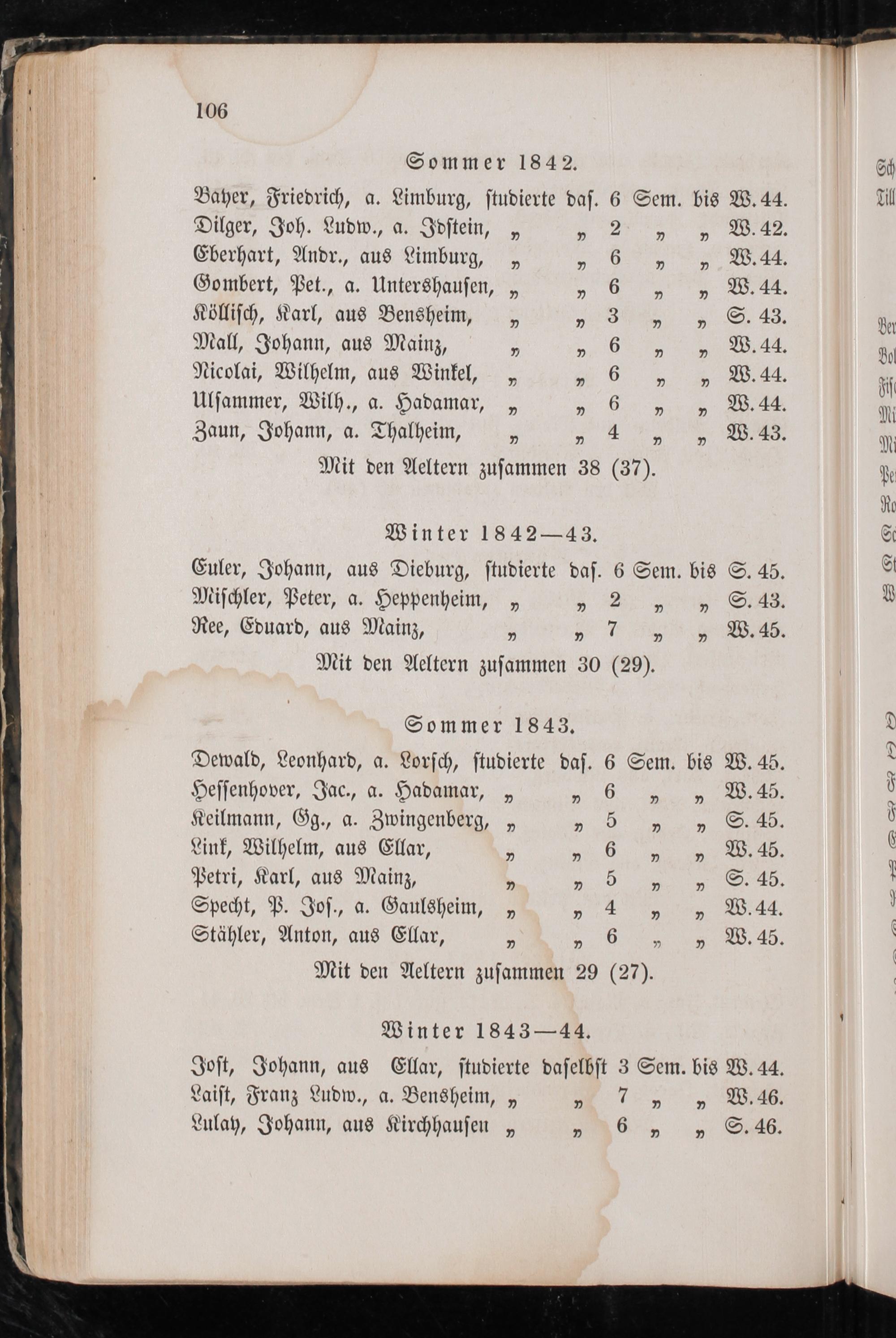 Dilger, Joh. Ludw., a. Idſtein,„„ 2„„ W. 42. Eberhart, Andr., aus Limburg,„„ 6„„ W. 14. Gombert, Pet., a. Untershauſen,„„ 6„„ W. 14. Kölliſch, Karl, aus Bensheim,„„ 3„„ S. 43. ger Mall, Johann, aus Mainz, 7„ 6„„ W. 44. go Nicolai, Wilhelm, aus Winkel,„„ 6„„ W. 44. Fi Ulſammer, Wilh., a. Hadamar,„„ G„„ W. 44. A Zaun, Johann, a. Thalheim,„„ 4„„ W. 43. R Mit den Aeltern zuſammen 38(37). pe R Winter 1842— 43. 8 Euler, Johann, aus Dieburg, ſtudierte daſ. 6 Sem. bis S. 45. S Miſchler, Peter, a. Heppenheim,„„ 2„„ S. 43. d