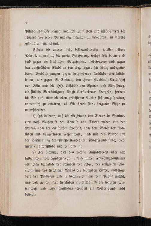 Jugend vor jeder Verſuchung möglichſt zu bewahren, in Abrede di geſtellt zu ſein ſcheint. be Judem ich andere ſehr beklagenswerthe Stellen Ihrer Schrift, namentlich die große Irreverenz, welche Sie darin viel⸗ 76 fach gegen die kirchlichen Vorgeſetzten, insbeſondere auch gegen und den apoſtoliſchen Stuhl an den Tag legen, die völlig unbegrün⸗ Be deten Verdächtigungen gegen hochſtehende kirchliche Perſönlich⸗ un keiten, wie gegen S. Eminenz den Herrn Cardinal⸗Erzbiſchof ho von Cöln und die HH. Biſchöfe von Speyer und Straßburg, die ſittliche Verdächtigung längſt Verſtorbener übergehe, fordere w ich Sie auf, über die oben präciſirten Punkte ſich auszuſprechen, ſch namentlich zu erklären, ob Sie bereit ſind, folgende Sätze zu in unterſchreiben. h 1) Ich bekenne, daß die Erziehung des Clerus in Semina⸗ E rien nach Vorſchrift des Concils von Trient weder mit der 3 Moral, noch der„chriſtlichen Freiheit, noch dem Wohle der kirch⸗ A lichen und bürgerlichen Geſellſchaft, noch mit der Würde und t der Beſtimmung des Prieſterſtandes im Widerſpruch ſteht, viel⸗ a mehr eine chriſtliche und heilſame iſt. n