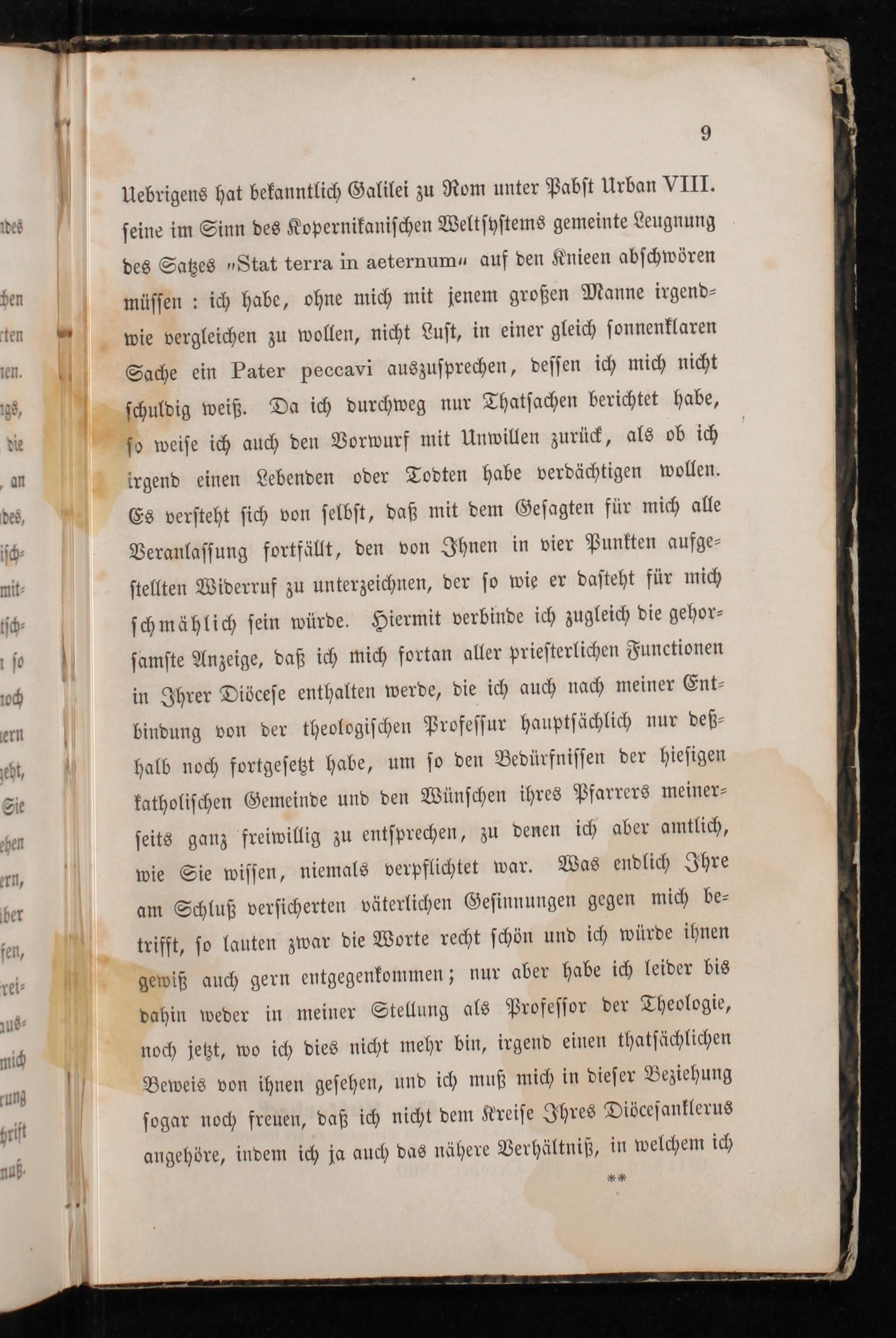 irgend einen Lebenden oder Todten habe verdächtigen wollen. Es verſteht ſich von ſelbſt, daß mit dem Geſagten für mich alle Veranlaſſung fortfällt, den von Ihnen in vier Punkten aufge⸗ ſtellten Widerruf zu unterzeichnen, der ſo wie er daſteht für mich ſchmählich ſein würde. Hiermit verbinde ich zugleich die gehor⸗ ſamſte Anzeige, daß ich mich fortan aller prieſterlichen Functionen in Ihrer Diöceſe enthalten werde, die ich auch nach meiner Ent⸗ bindung von der theologiſchen Profeſſur hauptſächlich nur deß⸗ halb noch fortgeſetzt habe, um ſo den Bedürfniſſen der hieſigen katholiſchen Gemeinde und den Wünſchen ihres Pfarrers meiner⸗ ſeits ganz freiwillig zu entſprechen, zu denen ich aber amtlich, wie Sie wiſſen, niemals verpflichtet war. Was endlich Ihre am Schluß verſicherten väterlichen Geſinnungen gegen mich be— trifft, ſo lauten zwar die Worte recht ſchön und ich würde ihnen gewiß auch gern entgegenkommen; nur aber habe ich leider bis dahin weder in meiner Stellung als Profeſſor der Theologie, noch jetzt, wo ich dies nicht mehr bin, irgend einen thatſächlichen Beweis von ihnen geſehen, und ich muß mich in dieſer Beziehung ſogar noch freuen, daß ich nicht dem Kreiſe Ihres Diöceſanklerus