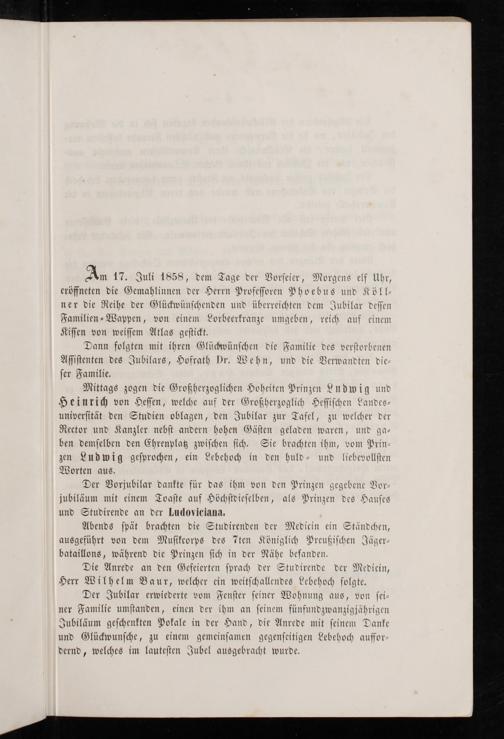 Am 17. Juli 1858, dem Tage der Vorfeier, Morgens elf Uhr, eröffneten die Gemahlinnen der Herrn Profeſſoren Phoebus und Köll⸗ ner die Reihe der Glückwünſchenden und überreichten dem Jubilar deſſen Familien⸗Wappen, von einem Lorbeerkranze umgeben, reich auf einem Kiſſen von weiſſem Atlas geſtickt.