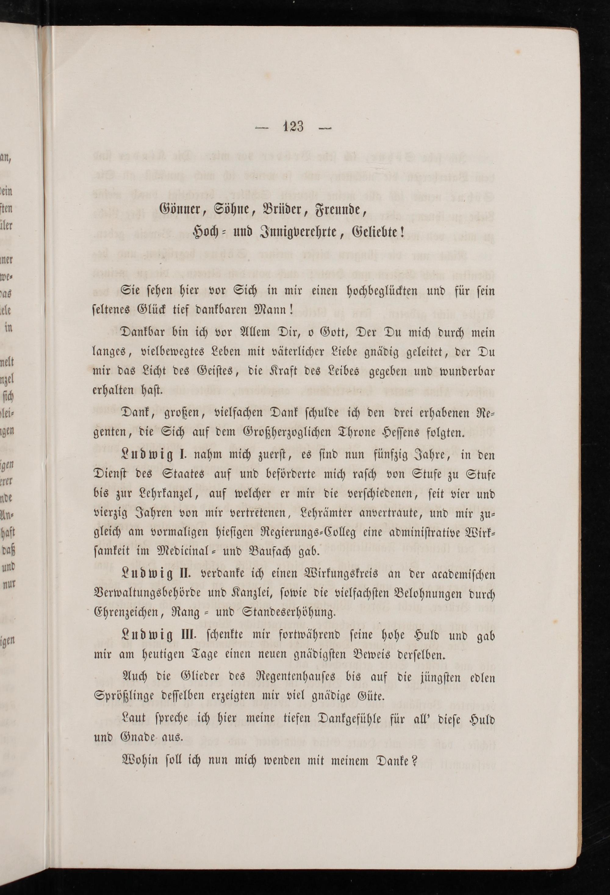 Ludwig I. nahm mich zuerſt, es ſind nun fünfzig Jahre, in den Dienſt des Staates auf und beförderte mich raſch von Stufe zu Stufe bis zur Lehrkanzel, auf welcher er mir die verſchiedenen, ſeit vier und vierzig Jahren von mir vertretenen, Lehrämter anvertraute, und mir zu⸗ gleich am vormaligen hieſigen Regierungs⸗Colleg eine adminiſtrative Wirk⸗ ſamkeit im Medicinal⸗ und Baufach gab.