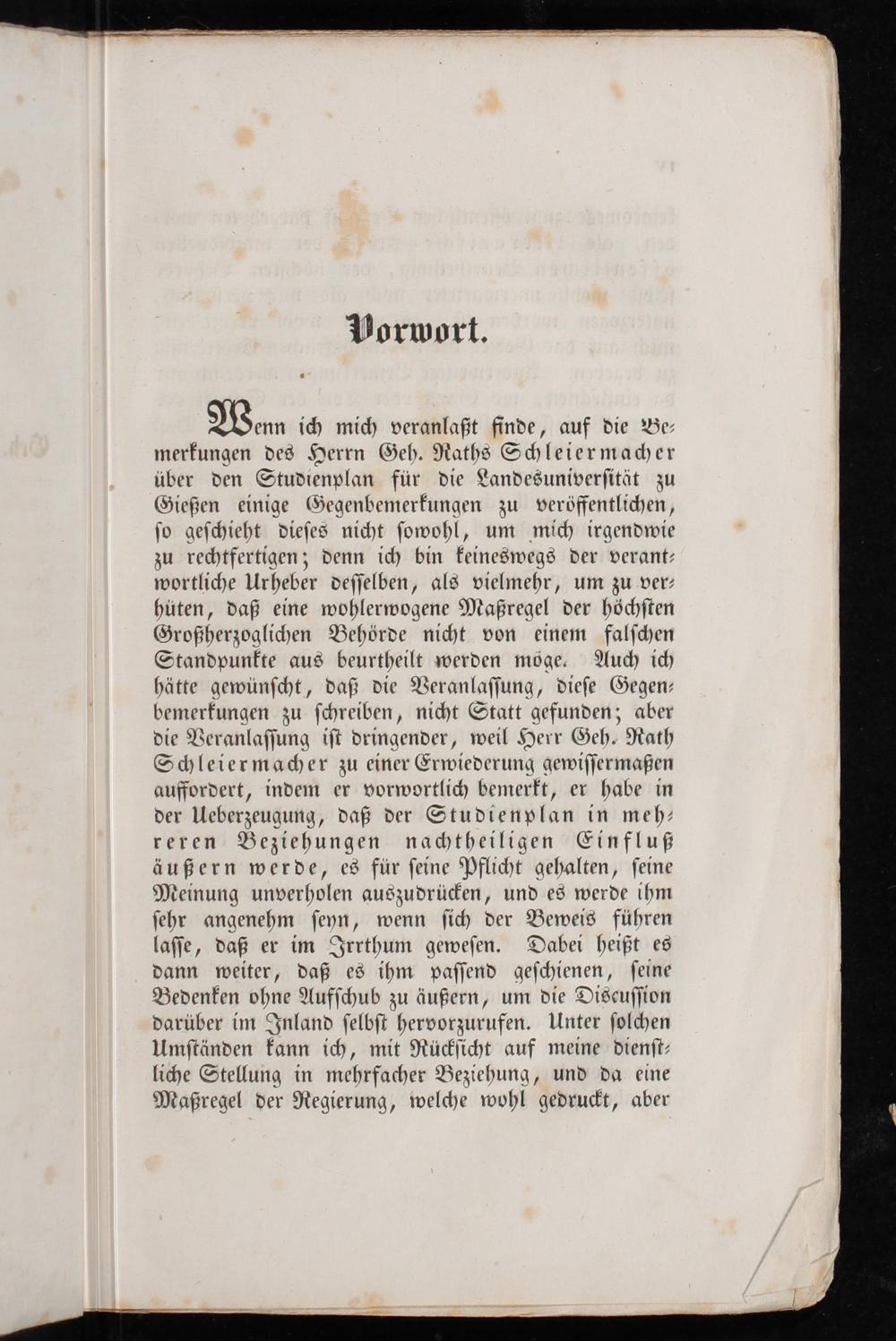 Wenn ich mich veranlaßt finde, auf die Be⸗ merkungen des Herrn Geh. Raths Schleiermacher über den Studienplan für die Landesuniverſität zu Gießen einige Gegenbemerkungen zu veröffentlichen, ſo geſchieht dieſes nicht ſowohl, um mich irgendwie zu rechtfertigen; denn ich bin keineswegs der verant⸗ wortliche Urheber deſſelben, als vielmehr, um zu ver⸗ hüten, daß eine wohlerwogene Maßregel der höchſten Großherzoglichen Behörde nicht von einem falſchen Standpunkte aus beurtheilt werden möge. Auch ich hätte gewünſcht, daß die Veranlaſſung, dieſe Gegen⸗ bemerkungen zu ſchreiben, nicht Statt gefunden; aber die Veranlaſſung iſt dringender, weil Herr Geh. Rath Schleiermacher zu einer Erwiederung gewiſſermaßen auffordert, indem er vorwortlich bemerkt, er habe in der Ueberzeugung, daß der Studienplan in meh—⸗ reren Beziehungen nachtheiligen Einfluß äußern werde, es für ſeine Pflicht gehalten, ſeine Meinung unverholen auszudrücken, und es werde ihm ſehr angenehm ſeyn, wenn ſich der Beweis führen laſſe, daß er im Irrthum geweſen. Dabei heißt es dann weiter, daß es ihm paſſend geſchienen, ſeine Bedenken ohne Aufſchub zu äußern, um die Discuſſion darüber im Inland ſelbſt hervorzurufen. Unter ſolchen Umſtänden kann ich, mit Rückſicht auf meine dienſt⸗ liche Stellung in mehrfacher Beziehung, und da eine Maßregel der Regierung, welche wohl gedruckt, aber