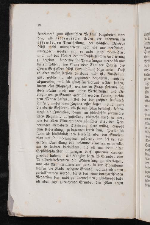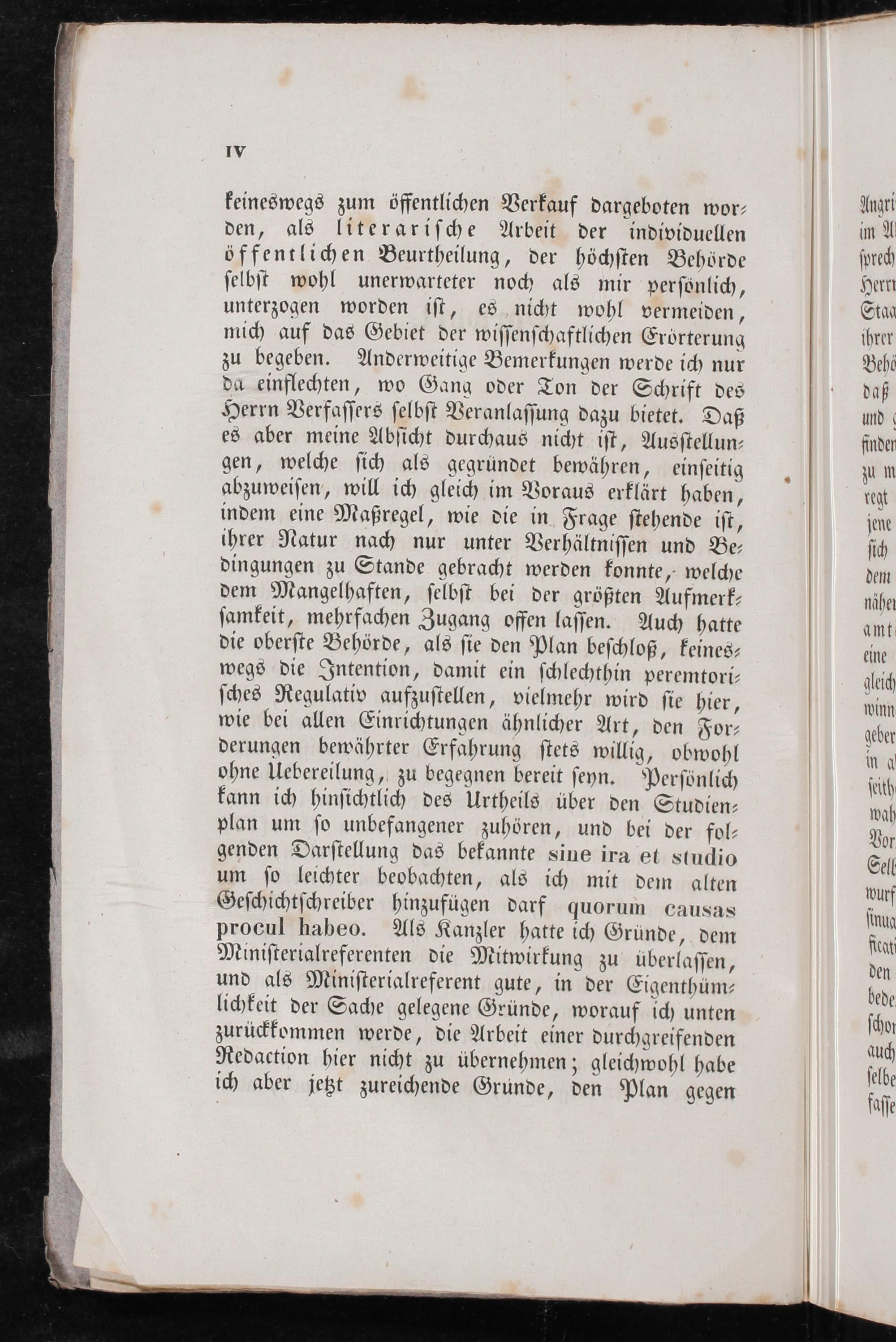 keineswegs zum öffentlichen Verkauf dargeboten wor— den, als literariſche Arbeit der individuellen öffentlichen Beurtheilung, der höchſten Behörde ſelbſt wohl unerwarteter noch als mir perſönlich, unterzogen worden iſt, es nicht wohl vermeiden, mich auf das Gebiet der wiſſenſchaftlichen Erörterung zu begeben. Anderweitige Bemerkungen werde ich nur da einflechten, wo Gang oder Ton der Schrift des Herrn Verfaſſers ſelbſt Veranlaſſung dazu bietet. Daß es aber meine Abſicht durchaus nicht iſt, Ausſtellun⸗ gen, welche ſich als gegründet bewähren, einſeitig abzuweiſen, will ich gleich im Voraus erklärt haben, indem eine Maßregel, wie die in Frage ſtehende iſt, ihrer Natur nach nur unter Verhältniſſen und Be— dingungen zu Stande gebracht werden konnte, welche dem Mangelhaften, ſelbſt bei der größten Aufmerk⸗ ſamkeit, mehrfachen Zugang offen laſſen. Auch hatte die oberſte Behörde, als ſie den Plan beſchloß, keines⸗ wegs die Intention, damit ein ſchlechthin peremtori— ſches Regulativ aufzuſtellen, vielmehr wird ſie hier, wie bei allen Einrichtungen ähnlicher Art, den For⸗ derungen bewährter Erfahrung ſtets willig, obwohl ohne Uebereilung, zu begegnen bereit ſeyn. Perſönlich kann ich hinſichtlich des Urtheils über den Studien⸗ plan um ſo unbefangener zuhören, und bei der fol⸗ genden Darſtellung das bekannte sine ira et studio um ſo leichter beobachten, als ich mit dem alten Geſchichtſchreiber hinzufügen darf quorum causas procul habeo. Als Kanzler hatte ich Gründe, dem Miniſterialreferenten die Mitwirkung zu überlaſſen, und als Miniſterialreferent gute, in der Eigenthüm⸗ lichkeit der Sache gelegene Gründe, worauf ich unten zurückkommen werde, die Arbeit einer durchgreifenden Redaction hier nicht zu übernehmen; gleichwohl habe ich aber jetzt zureichende Grunde, den Plan gegen