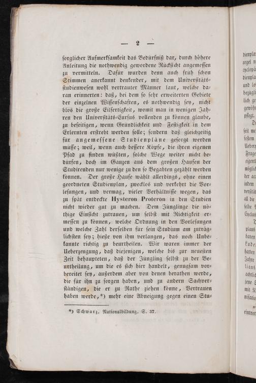 ſorglicher Aufmerkſamkeit das Bedüͤrfniß dar, durch höhere Anleitung die nothwendig gewordene Rückſicht angemeſſen zu vermitteln. Dafuͤr wurden denn auch fruͤh ſchon Stimmen anerkannt denkender, mit dem Univerſitäts⸗ ſtudienweſen wohl vertrauter Männer laut, welche da⸗ ran erinnerten: daß, bei dem ſo ſehr erweiterten Gebiete der einzelnen Wiſſenſchaften, es nothwendig ſey, nicht blos die große Eilfertigkeit, womit man in wenigen Jah— ren den Univerſitäts⸗Curſus vollenden zu können glaube, zu beſeitigen, wenn Gründlichkeit und Feſtigkeit in dem Erlernten erſtrebt werden ſolle; ſondern daß gleichzeitig für angemeſſene Studienpläne geſorgt werden müſſe; weil, wenn auch beſſere Köpfe, die ihren eigenen Pfad zu finden wüßten, ſolche Wege weiter nicht be— dürfen, doch im Ganzen aus dem großen Haufen der Studirenden nur wenige zu den ſo Begabten gezählt werden können. Der große Haufe wählt allerdings, ohne einen geordneten Studienplan, zwecklos und verkehrt die Vor⸗ leſungen, und vermag, vieler Verhältniſſe wegen, das zu ſpät entdeckte Hysteron Proteron in den Studien nicht wieder gut zu machen. Dem Jünglinge die nö⸗ thige Einſicht zutrauen, um ſelbſt mit Richtigkeit er⸗ meſſen zu können, welche Ordnung in den Vorleſungen und welche Zahl derſelben fuͤr ſein Studium am zuträg⸗ lichſten ſey; hieße von ihm verlangen, das noch Unbe⸗ kannte richtig zu beurtheilen. Wir waren immer der Ueberzeugung, daß diejenigen, welche bis zur neueſten Zeit behaupteten, daß der Jüngling ſelbſt zu der Be⸗ urtheilung, um die es ſich hier handelt, genugſam vor⸗ bereitet ſey, außerdem aber von denen berathen werde, die fur ihn zu ſorgen haben, und zu andern Sachver⸗ ſtändigen, die er zu Rathe ziehen könne, Vertrauen haben werde,*) mehr eine Abneigung gegen einen Stu⸗