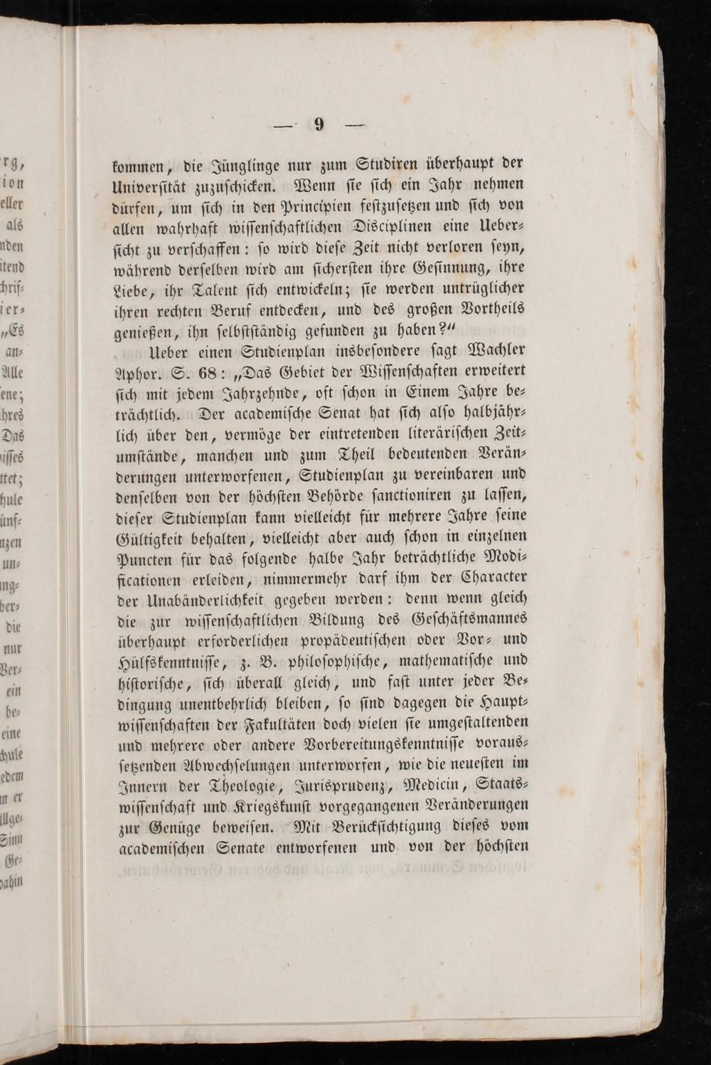 Ueber einen Studienplan insbeſondere ſagt Wachler Aphor. S. 68:„Das Gebiet der Wiſſenſchaften erweitert ſich mit jedem Jahrzehnde, oft ſchon in Einem Jahre be⸗ trächtlich. Der academiſche Senat hat ſich alſo halbjähr⸗ lich über den, vermöge der eintretenden literäriſchen Zeit⸗ umſtände, manchen und zum Theil bedeutenden Verän⸗ derungen unterworfenen, Studienplan zu vereinbaren und denſelben von der höchſten Behörde ſanctioniren zu laſſen, dieſer Studienplan kann vielleicht für mehrere Jahre ſeine Gültigkeit behalten, vielleicht aber auch ſchon in einzelnen Puncten für das folgende halbe Jahr beträchtliche Modi⸗ ficationen erleiden, nimmermehr darf ihm der Character der Unabänderlichkeit gegeben werden: denn wenn gleich die zur wiſſenſchaftlichen Bildung des Geſchäftsmannes überhaupt erforderlichen propädeutiſchen oder Vor- und Hulfskenntniſſe, z. B. philoſophiſche, mathematiſche und hiſtoriſche, ſich überall gleich, und faſt unter jeder Be⸗ dingung unentbehrlich bleiben, ſo ſind dagegen die Haupt⸗ wiſſenſchaften der Fakultäten doch vielen ſie umgeſtaltenden und mehrere oder andere Vorbereitungskenntniſſe voraus⸗ ſetzenden Abwechſelungen unterworfen, wie die neueſten im Innern der Theologie, Jurisprudenz, Medicin, Staats⸗ wiſſenſchaft und Kriegskunſt vorgegangenen Veränderungen zur Genüge beweiſen. Mit Berückſichtigung dieſes vom academiſchen Senate entworfenen und von der höchſten