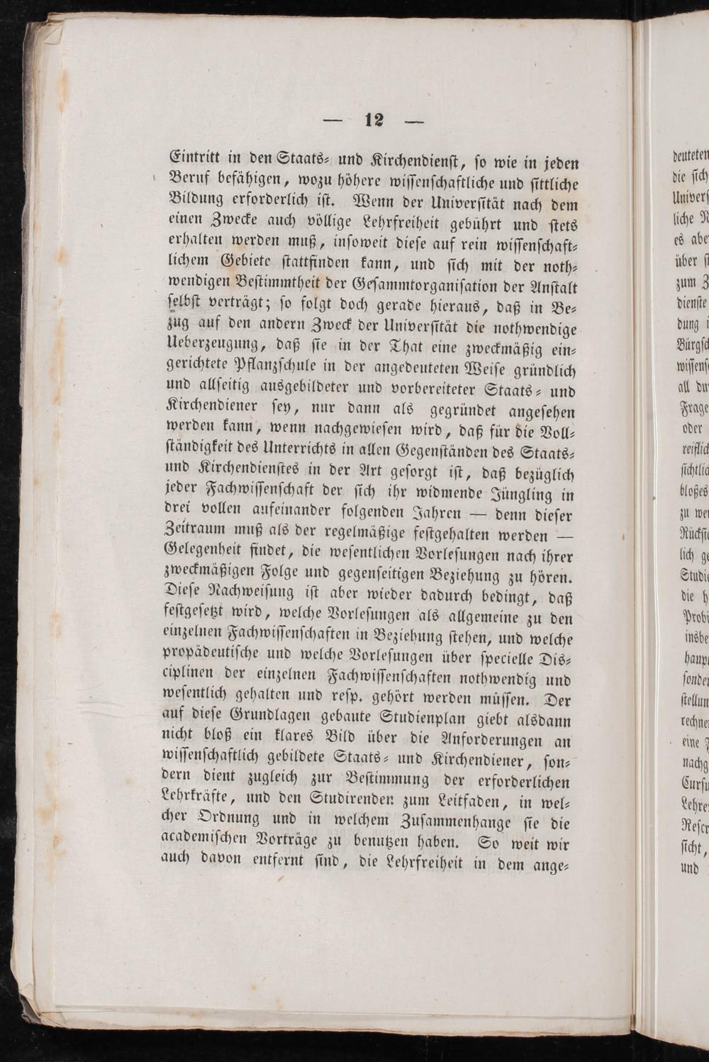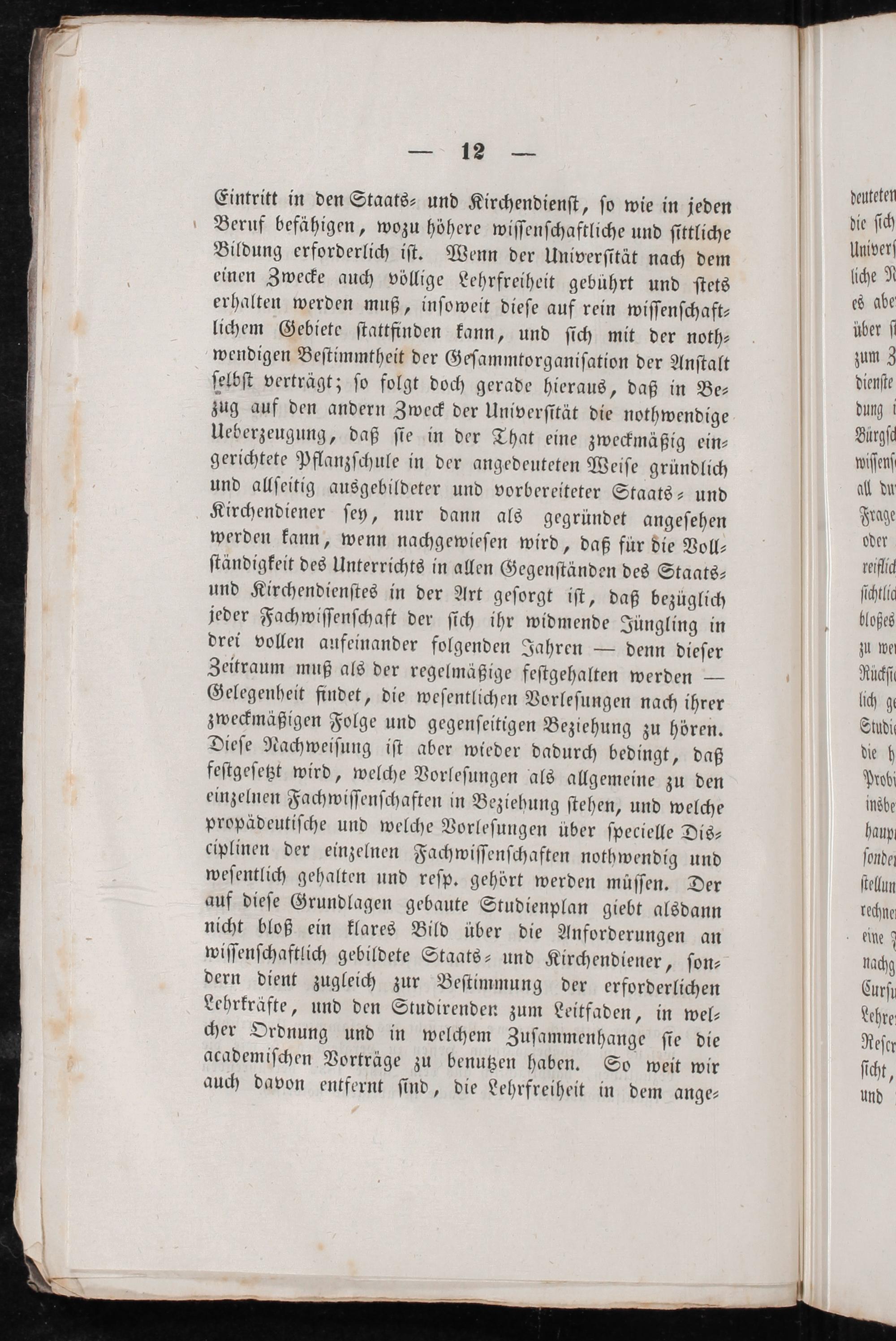 Eintritt in den Staats- und Kirchendienſt, ſo wie in jeden Beruf befähigen, wozu höhere wiſſenſchaftliche und ſittliche Bildung erforderlich iſt. Wenn der Univerſität nach dem einen Zwecke auch völlige Lehrfreiheit gebührt und ſtets erhalten werden muß, inſoweit dieſe auf rein wiſſenſchaft— lichem Gebiete ſtattfinden kann, und ſich mit der noth⸗ wendigen Beſtimmtheit der Geſammtorganiſation der Anſtalt ſelbſt verträgt; ſo folgt doch gerade hieraus, daß in Be⸗ zug auf den andern Zweck der Univerſität die nothwendige Ueberzeugung, daß ſie in der That eine zweckmäßig ein⸗ gerichtete Pflanzſchule in der angedeuteten Weiſe gründlich und allſeitig ausgebildeter und vorbereiteter Staats- und Kirchendiener ſey, nur dann als gegründet angeſehen werden kann, wenn nachgewieſen wird, daß für die Voll⸗ ſtändigkeit des Unterrichts in allen Gegenſtänden des Staats⸗ und Kirchendienſtes in der Art geſorgt iſt, daß bezüglich jeder Fachwiſſenſchaft der ſich ihr widmende Jüngling in drei vollen aufeinander folgenden Jahren— denn dieſer Zeitraum muß als der regelmäßige feſtgehalten werden— Gelegenheit findet, die weſentlichen Vorleſungen nach ihrer zweckmäßigen Folge und gegenſeitigen Beziehung zu hören. Dieſe Nachweiſung iſt aber wieder dadurch bedingt, daß feſtgeſetzt wird, welche Vorleſungen als allgemeine zu den einzelnen Fachwiſſenſchaften in Beziehung ſtehen, und welche propädeutiſche und welche Vorleſungen über ſpecielle Dis⸗ ciplinen der einzelnen Fachwiſſenſchaften nothwendig und weſentlich gehalten und reſp. gehört werden müſſen. Der auf dieſe Grundlagen gebaute Studienplan giebt alsdann nicht bloß ein klares Bild über die Anforderungen an wiſſenſchaftlich gebildete Staats- und Kirchendiener, ſon⸗ dern dient zugleich zur Beſtimmung der erforderlichen Lehrkräfte, und den Studirenden zum Leitfaden, in wel⸗ cher Ordnung und in welchem Zuſammenhange ſie die academiſchen Vorträge zu benutzen haben. So weit wir auch davon entfernt ſind, die Lehrfreiheit in dem ange⸗