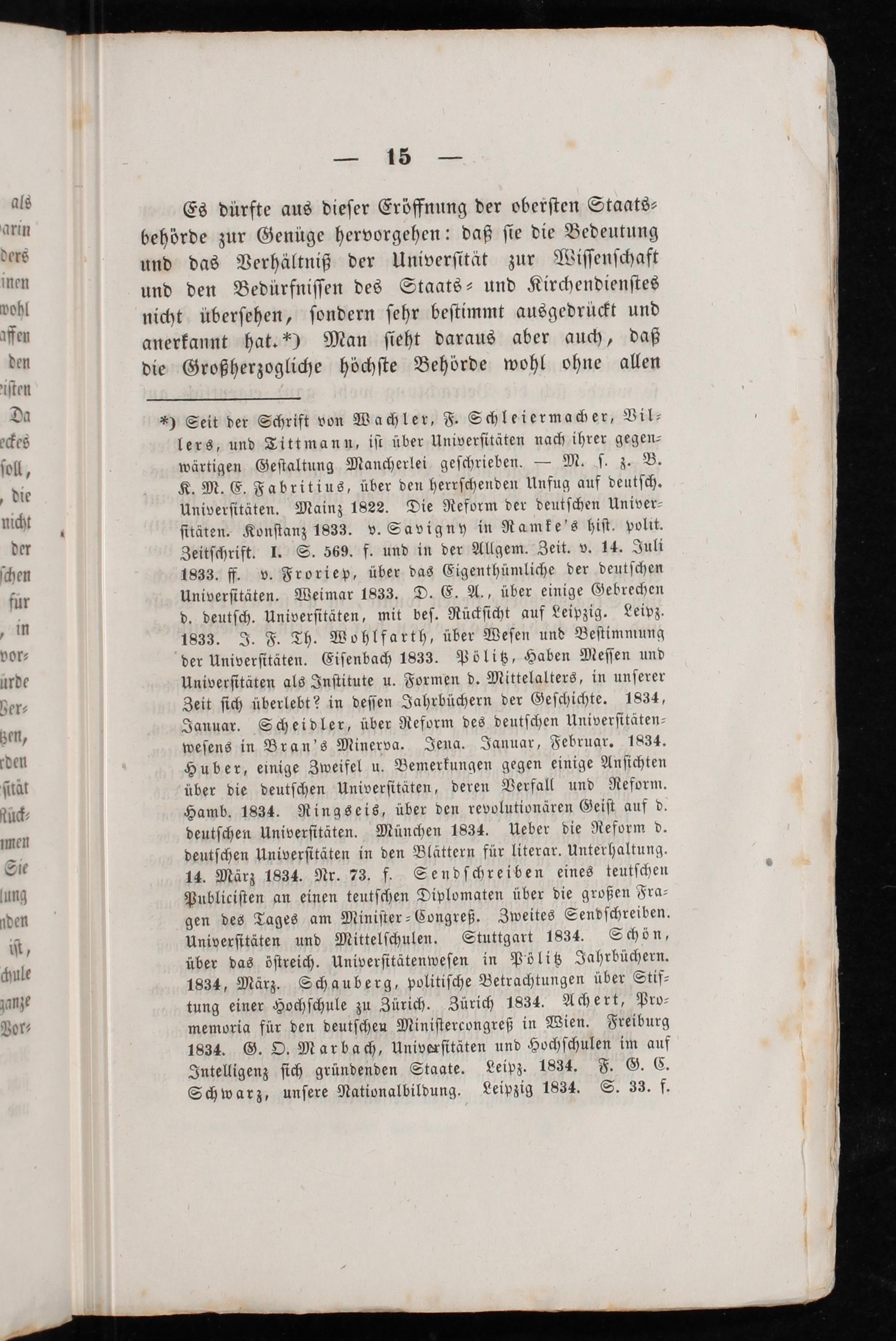 Wen und den Beduürfniſſen des Staats- und Kirchendienſtes vohl nicht überſehen, ſondern ſehr beſtimmt ausgedrückt und affen anerkannt hat.*) Man ſieht daraus aber auch, daß den die Großherzogliche höchſte Behörde wohl ohne allen eiſten Da*) Seit der Schrift von Wachler, F. Schleiermacher, Vil⸗ eckes lers, und Tittmann, iſt über Univerſitäten nach ihrer gegen⸗ ſoll, wärtigen Geſtaltung Mancherlei geſchrieben.— M. ſ. z. B. , die K. M. E. Fabritius, über den herrſchenden Unfug auf deutſch. nicht Univerſitäten. Mainz 1822. Die Reform der deutſchen Univer 8 ſitäten. Konſtanz 1833. v. Savigny in Ramke's hiſt. polit. Ider Zeitſchrift. I. S. 569. f. und in der Allgem. Zeit. v. 14. Juli ſchen 1833. ff. v. Froriep, über das Eigenthümliche der deutſchen für uUniverſitäten. Weimar 1833. D. E. A., über einige Gebrechen „in d. deutſch. Univerſitäten, mit beſ. Rückſicht auf Leipzig. Leipz. 1833. J. F. Th. Wohlfarth, über Weſen und Beſtimmung vor⸗ der Univerſitäten. Eiſenbach 1833. Pölitz, Haben Meſſen und urde Univerſitäten als Inſtitute u. Formen d. Mittelalters, in unſerer Ver⸗ Zeit ſich überlebt? in deſſen Jahrbüchern der Geſchichte. 1834, zen, Januar. Scheidler, über Reform des deutſchen Univerſitäten 9 weſens in Bran's Minerva. Jena. Januar, Februar. 1834. wen Huber, einige Zweifel u. Bemerkungen gegen einige Anſichten ſitat über die deutſchen Univerſitäten, deren Verfall und Reform. Kück⸗ Hamb. 1834. Ringseis, über den revolutionären Geiſt auf d. imen deutſchen Univerſitäten. München 1834. Ueber die Reform d. S deutſchen Univerſitäten in den Blättern für literar. Unterhaltung. 86 14. März 1834. Nr. 73. f. Sendſchreiben eines teutſchen ung Publiciſten an einen teutſchen Diplomaten über die großen Fra⸗ nden gen des Tages am Miniſter⸗Congreß. Zweites Sendſchreiben. iſt, Univerſitäten und Mittelſchulen. Stuttgart 1834. Schön, cule über das öſtreich. Univerſitätenweſen in Pölitz Jahrbüchern. . 1834, März. Schauberg, politiſche Betrachtungen über Stif⸗ ganze tung einer Hochſchule zu Zürich. Zürich 1834. Achert, Pro⸗ Vor⸗ memoria für den deutſchen Miniſtercongreß in Wien. Freiburg