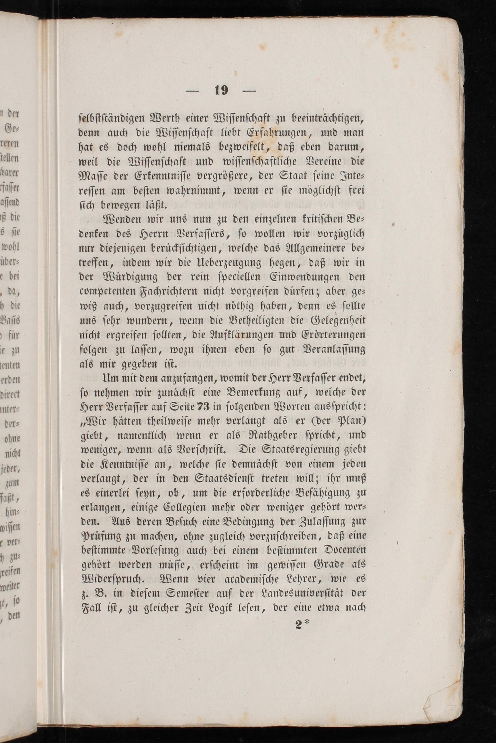 Um mit dem anzufangen, womit der Herr Verfaſſer endet, ſo nehmen wir zunächſt eine Bemerkung auf, welche der Herr Verfaſſer auf Seite 73 in folgenden Worten ausſpricht: „Wir hätten theilweiſe mehr verlangt als er(der Plan) giebt, namentlich wenn er als Rathgeber ſpricht, und weniger, wenn als Vorſchrift. Die Staatsregierung giebt die Kenntniſſe an, welche ſie demnächſt von einem jeden verlangt, der in den Staatsdienſt treten will; ihr muß es einerlei ſeyn, ob, um die erforderliche Befähigung zu erlangen, einige Collegien mehr oder weniger gehört wer⸗ den. Aus deren Beſuch eine Bedingung der Zulaſſung zur Prüfung zu machen, ohne zugleich vorzuſchreiben, daß eine beſtimmte Vorleſung auch bei einem beſtimmten Docenten gehört werden müſſe, erſcheint im gewiſſen Grade als Widerſpruch. Wenn vier academiſche Lehrer, wie es z. B. in dieſem Semeſter auf der Landesuniverſität der Fall iſt, zu gleicher Zeit Logik leſen, der eine etwa nach