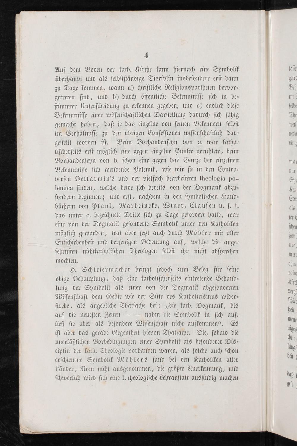 H. Schleiermacher bringt jedoch zum Beleg für ſeine obige Behauptung, daß eine katholiſcherſeits eintretende Behand⸗ lung der Symbolik als einer von der Dogmatik abgeſonderten Wiſſenſchaft dem Geiſte wie der Sitte des Katholicismus wider⸗ ſtrebe, als angebliche Thatſache bei:„die kath. Dogmatik, bis auf die neueſten Zeiten—— nahm die Symbolik in ſich auf, ließ ſie aber als beſondere Wiſſenſchaft nicht auffommen“. Es iſt aber das gerade Gegentheil hievon Thatſache. Die, ſobald die unerläßlichen Vorbedingungen einer Symbolik als beſonderer Dis⸗ ciplin der kath. Theologie vorhanden waren, als ſolche auch ſchon erſchienene Symbolik Möhlers fand bei den Katholiken aller Länder, Rom nicht ausgenommen, die größte Anerkennung, und ſchwerlich wird ſich eine k. theologiſche Lehranſtalt ausfindig machen