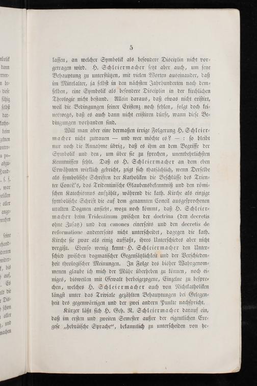 uralten Dogmen anſieht, wozu noch kömmt, daß H. Schleier⸗ macher beim Tridentinum zwiſchen der doctrina(den decretis ohne Zuſatz) und den canones einerſeits und den decretis de reformatione andererſeits nicht unterſcheidet, dagegen die kath. Kirche ſie zwar als einig auffaßt, ihres Unterſchiedes aber nicht vergißt. Ebenſo wenig kennt H. Schleiermacher den Unter⸗ ſchied zwiſchen dogmatiſcher Gegenſätzlichkeit und der Verſchieden⸗ heit theologiſcher Meinungen. In Folge des bisher Wahrgenom⸗ menen glaube ich mich der Mühe überheben zu können, noch ei⸗ niges, bisweilen mit Gewalt herbeigezogene, Einzelne zu beſpre⸗ chen, welches H. Schleiermacher auch von Nichtkatholiken längſt unter das Triviale gezählten Behauptungen bei Gelegen⸗ heit des gegenwärtigen und der zwei andern Punkte nachſpricht. Kürzer läßt ſich H. Geh. R. Schleiermacher darauf ein, daß im erſten und zweiten Semeſter außer der eigentlichen Exe⸗ geſe„hebräiſche Sprache“, bekanntlich zu unterſcheiden von he⸗