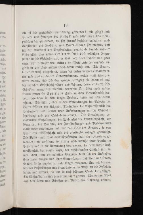 13 wie iſt die gerichtliche Einrichtung geworden? wie ging's mit Steuern und Finanzen des Reichs? und billig muß das Com pendium die Hauptdata, die ſich hierauf beziehen, enthalten, auch Conſtitution des Reichs ſo zum Haupt⸗Thema ſich machen, daß ſich die Auswahl der Begebenheiten vorzüglich danach richtet.“ Nicht allein aber nahm Spittler ſomit dieſe wichtigen Gegen⸗ ſtände in die Geſchichte auf, er that noch einen Schritt und zwar einen ſehr einflußreichen weiter: er führte dieſe Gegenſtände zu⸗ gleich in den akademiſchen Geſchichtsunterricht ein. Die Saaten, die er dadurch ausgeſtreut, haben bei vielen höheren Staatsbeam⸗ ten und ausgezeichneten Staatsmännern, welche einſt ſeine Zu⸗ hörer waren, ſicherlich ihre Früchte getragen; ſie haben es auch bei manchen Geſchichtſchreibern und Lehrern, denen er durch ſeine Schriften anregendes Vorbild geworden iſt. Aber noch andere Seiten traten ſeit Spittlers Zeiten in ihrer Bedeutſamkeit her⸗ vor, beſonders in dem langen Frieden, deſſen ſich Deutſchland erfreut. Die ſtillen, aber raſchen Entwicklungen im Schooße der Völker feſſelten mit ſteigender Theilnahme die? Aufmerkſamkeit des Beobachters und ſtellten neue Anforderungen an die Geſchicht⸗ Lieidane und den Geſchichtsunterricht. Die Berechtigung der rriellen Entfaltungen, die Wichtigkeit der Landwirthſchaft, der Gewerbe, des Handels, der Fortſchaffungs- und Verkehrsmittel ward tiefer empfunden und wie von Seite des Staates, ſo von Seiten der Wiſſenſchaft und des Lehrſtuhls richtiger gewürdigt. Die Volks⸗ und Staatswirthſchaftslehre hat eine Bedeutung ge⸗ wonnen, die derſelben, ſo ſtreitig noch manche ihrer Punkte im Princip und in der Anwendung ſeyn mögen, die geſpannteſte Auf merkſamkeit, den regſten Eifer, den entſchiedenſten Einfluß für im⸗ mer ſichert, und die politiſche Geſchichte kann ſich der Aufnahme ihrer Ermittlungen und ihrer Einwirkungen auf Volk und Staat, ſo weit ſie ihr angehören, nicht länger erwe hren. Und wie die ma⸗ teriellen Beſtrebungen und deren Erfolge ihr Recht an die Geſchichte haben und fordern, ſo und in noch höherem Grade die geiſtigen. Die Wiſſenſchaften ſind dem Leben näher getreten. Wie ſie zum Theil
