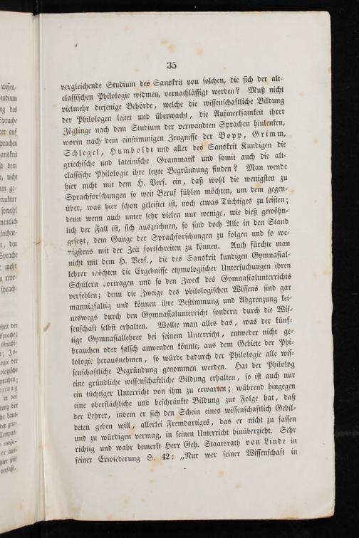 vergleichende Studium des Sanskrit von ſolchen, die ſich der alt⸗ claſſiſchen Philologie widmen, vernachläſſigt werden? Muß nicht vielmehr diejenige Behörde, welche die wiſſenſchaftliche Bildung der Philologen leitet und überwacht, die Aufmerkſamkeit ihrer Zöglinge nach dem Studium der verwandten Sprachen hinlenken, worin nach dem einſtimmigen Zeugniſſe der Bopp, Grimm, Schlegel, Hu mboldt und aller des Sanskrit Kundigen die griechiſche und lateiniſche Grammatik und ſomit auch die alt⸗ claſſiſche Philologie ihre letzte Begründung finden? Man wende hier nicht mit dem H. Verf. ein, daß wohl die wenigſten zu Sprachforſchungen ſo weit Beruf fühlen möchten, um dem gegen⸗ über, was hier ſchon geleiſtet iſt, noch etwas Tüchtiges zu leiſten; denn wenn auch unter ſehr vielen nur wenige, wie dieß gewöhn⸗ lich der Fall iſt, ſich auszeichnen, ſo ſind doch Alle in den Stand geſetzt, dem Gange der Sprachforſchungen zu folgen und ſo we⸗ nigſtens mit der Zeit fortſchreiten zu können. Auch fürchte man nicht mit dem H. Verf., die des Sanskrit kundigen Gymnaſial⸗ lehrer möchten die Ergebniſſe etymologiſcher Unterſuchungen ihren Schülern„ortragen und ſo den Zweck des Gymnaſialunterrichts verfehlen; denn die Zweige des philologiſchen Wiſſens ſind gar mannigfaltig und können ihre Beſtimmung und Abgrenzung kei⸗ neswegs durch den Gymnaſialunterricht ſondern durch die Wiſ⸗ ſenſchaft ſelbſt erhalten. Wollte man alles das, was der künf⸗ tige Gymnaſiallehrer bei ſeinem Unterricht, entweder nicht ge⸗ brauchen oder falſch anwenden könnte, aus dem Gebiete der Phi⸗ lologie herausnehmen, ſo würde dadurch der Philologie alle wiſ⸗ ſenſchaftliche Begründung genommen werden. Hat der Philolog eine gründliche wiſſenſchaftliche Bildung erhalten, ſo iſt auch nur ein tüchtiger Unterricht von ihm zu erwarten; während hingegen eine oberflächliche und beſchränkte Bildung zur Folge hat, daß der Lehrer, indem er ſich den Schein eines wiſſenſchaftlich Gebil⸗ deten geben will, allerlei Fremdartiges, das er nicht zu faſſen und zu würdigen vermag, in ſeinen Unterricht hinüberzieht. Sehr richtig und wahr bemerkt Herr Geh. Staatsrath von Linde in ſeiner Erwiederung S. 42:„Nur wer ſeiner Wiſſenſchaft in